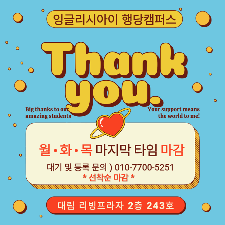 감사합니다! 월·화·목 마지막 타임 마감되었습니다. 대기 및 그 외 시간 등록 문의는 ☎ 010-7700-5251 대림 리빙 프라자 2층 243호 잉글리시아이 * 남은 클래스 선착순 마감 * <img src="https://blogthumb.pstatic.net/MjAyNjAxMDlfMTQ3/MDAxNzY3OTMwNTExNDI2.jtTWEtcz7Fu6ipjI_mV398w4x02KRYUsYD-4jTdnogEg.t2zB3NZYLC9CTx9-WrPPEqQ-alw83nJJTp9ky7y6u-Ug.PNG/%C1%A6%B8%F1%C0%BB_%C0%D4%B7%C2%C7%D8%C1%D6%BC%BC%BF%E4_%289%29.png?type=s3" />