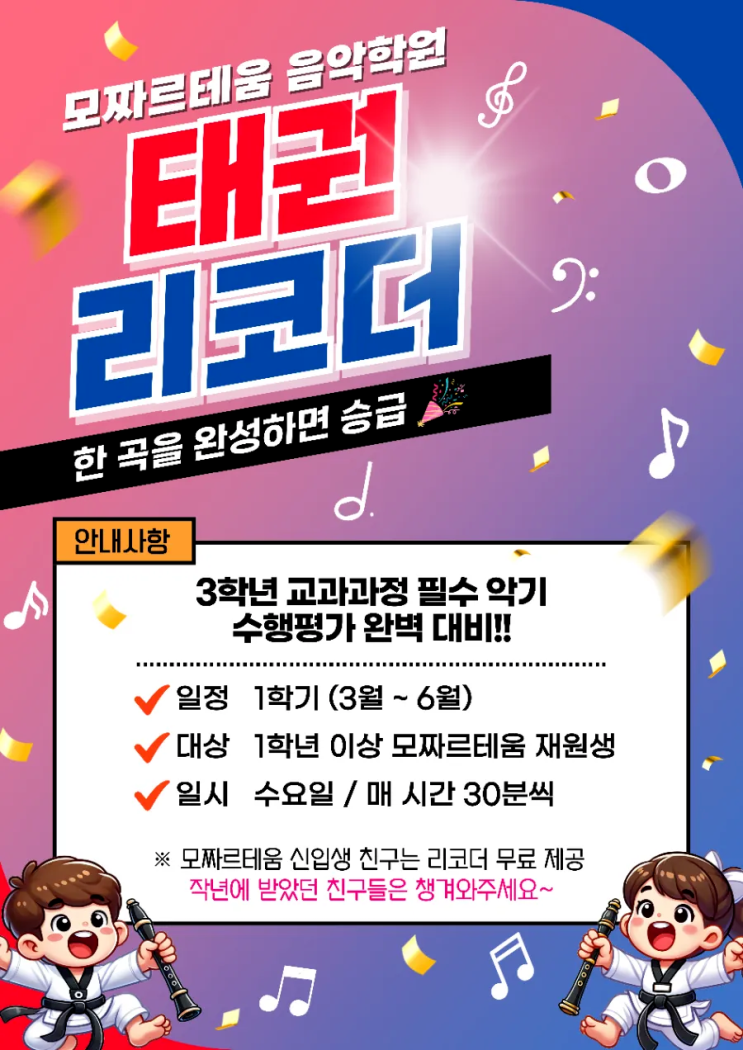 기본에 진심을 담고 기초부터 탄탄하게 가르치는 것이 목표인 모짜르테움 원장 모짤쌤입니다:) 넘 올만에 찾아왔어요 26년도 상반기 수요 특강은 리코더!! 그것도 특별하게 태권 리코더입니다 태권 리코더가 궁금하시죠?? 궁금하시면 모짤테움으로 오세요 모짤테움 신입생은 리코더가 선물로 준비되어 있답니다 태권 리코더는 흰띠부터 검은띠까지~~ 한 곡을 연습해서 음원(MR반주)에 맞춰 연주하면 다음띠로 승급 재미있게 연습하고 성취감도 높여주고 음원에 맞춰야 하니 정확한 리듬과 박자로 연주해야해요✨️✨️ 수업이 넘 잼난 형제의 초록띠 연주 "성자의 행진" 사이좋게 함께 파랑띠로 승급 점점....... <img src="https://blogthumb.pstatic.net/MjAyNjAzMjlfMjM2/MDAxNzc0NzQ2NTMwMTI5.fBXfvXkcndmSkJaPari4eUwaAK_LIZMmQEynqCfSi7wg.PhKoZWipzm1gwo0PCRXPCpqvp34AZ_JwUHVXMDnoKnUg.PNG/900%A3%DF1772414187633.png?type=s3" />