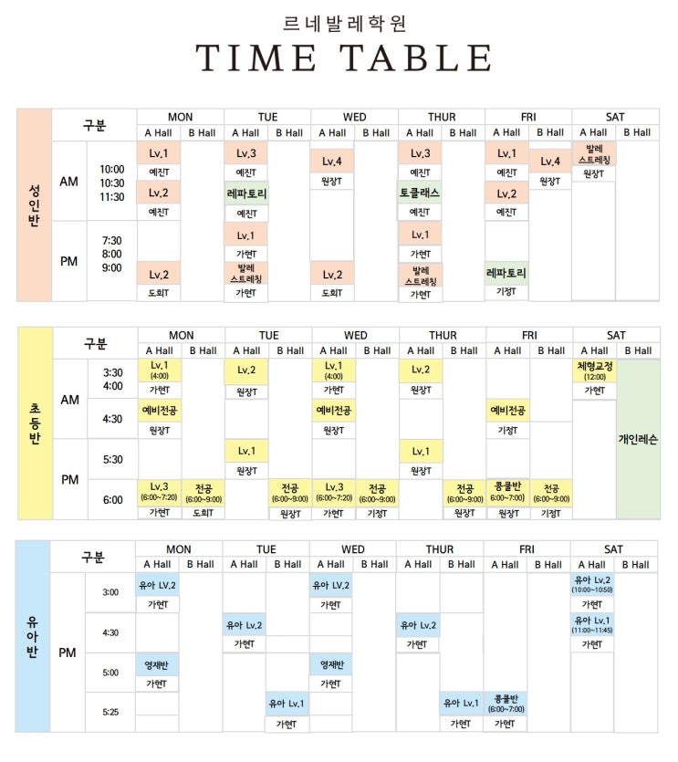 고촌발레전문 '르네발레학원' 2026년 새학기 전체 시간표
