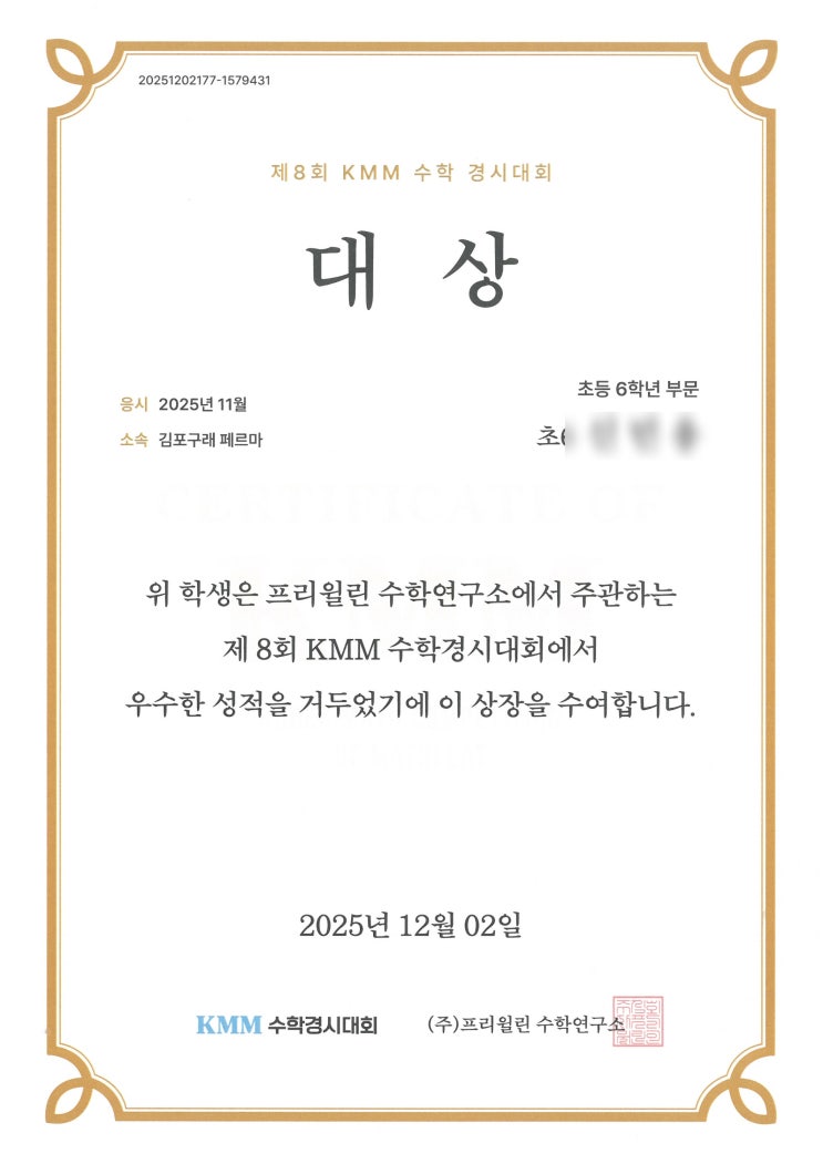 안녕하세요. 구래동 수학학원 '생각하는 수학' 페르마 김포구래캠퍼스입니다. 저희 페르마 김포구래캠퍼스에서는 매월 마지막주에 KMM 수학경시대회를 실시하고 있습니다. KMM 수학경시대회는 (주)프리윌린 수학연구소에서 출제되며 매월 전국에서 펼쳐지는 수학 실력을 증명할 수 있는 대회입니다. 제9회 경시대회에서도 우리친구들 진지한 태도로 집중력과 사고력을 발휘하였습니다~! -수상결과- 총 100점 만점으로 채점된 이번 대회에서는 아래와 같은 우수한 성과가 나왔습니다. 대상 : 1명 금상 : 2명 은상 : 8명 동상 : 17명 장려상 : 5명 우리 페르마 초등부 친구들 경시대회에 열심히 해주어서 기특하고 대견합니다. 경....... <img src="https://blogthumb.pstatic.net/MjAyNjAxMTNfMjA5/MDAxNzY4Mjg4MzQ5NTIy.5ow00X-kiPd0t9Yu3XVfwUzbCYJ9Taqyln5LB8pFrn4g.AOyYCeBTst4GP6MOSzblD3_VwspsRmKdYV59hB5R_icg.JPEG/S25C-0i25120814420.jpg?type=s3" />