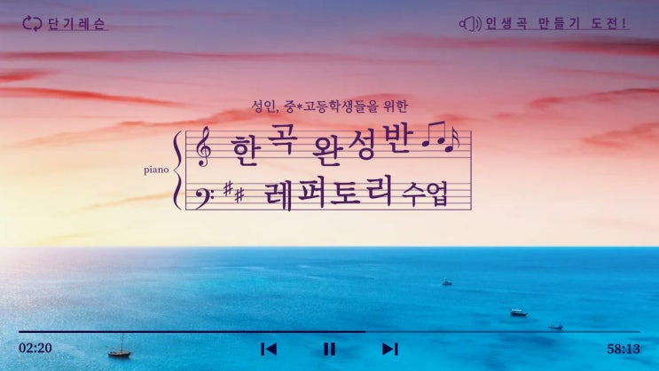 그때 그 곡... 한 번쯤은 제대로 연주해 보고 싶다..! 요즘 새해가 돼서인지 성인분들, 중, 고등학생들의 문의가 많습니다. 그동안 치고 싶었지만, 오랜 시간 동안 마음속으로 생각만 했던 곡들을 연주할 수 있는 한 곡 완성반, 레퍼토리 수업을 소개합니다. 인생곡 만들기 도전! 대상 바쁜 학업과 일상으로 피아노 학원에 선뜻 다니기 부담스러우셨던 분 성인, 중고등학생 수업 횟수 4주/ 8주/ 12주 중 선택 수업방식 50분 맞춤형 수업, 1:1개인 레슨 수업과정 ● 희망 곡을 바탕으로 상담을 통해 곡 선택 ● 곡 위주의 1:! 집중 레슨으로 마무리까지 코칭 ● 완성된 곡을 연주 영상으로 기록 (희망자에 한해서 진행) 인생곡 한 곡 완성으로 라....... <img src="https://blogthumb.pstatic.net/MjAyNjAxMjZfMjkg/MDAxNzY5Mzk5ODg4MTMw.ePNRPbtPoNvfwieHJEt3XBiU-AQYlG566QXLyCKeqskg.PNzezY_hodh7keHHT-vwG18iMkQU3M9OQNUABh46BQwg.JPEG/%3F%9D%B8%3F%83%9D%EA%B3%A1%EB%A7%8C%3F%93%A4%EA%B8%3F.jpg?type=s3" />