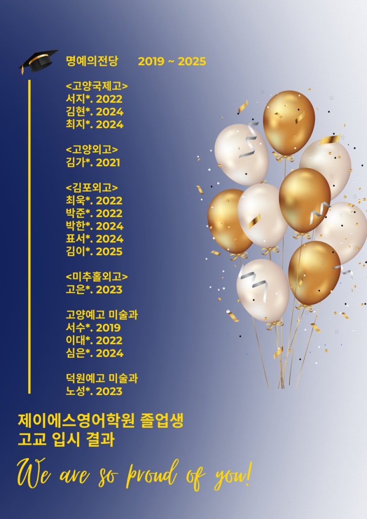 2016년 제이에스영어학원을 개원하고 2019년부터 특목고에 입학하는 학생들이 생기면서 현재까지의 결과입니다. 파닉스부터 원서수업과 중등내신수업까지 진행하였습니다. 영어학원인데 예술고등학교도 포함시킨 이유는 저희 에스더쌤이 수업이나 상담을 진행하면서 예술고등학교와 미술학원을 추천해주어서 진학한 경우이기 때문입니다. 심지어 중2 신규상담 때 2~3개월만 다닐 수 밖에 없게 되는걸 알면서도 예고진학을 추천하기도 했습니다. 그런 학생은 저희 원에서 조금밖에 수업을 안해서 명단에서 뺐음에도 특목고 진학한 학생들이 많죠?~ 연도는 입학연도입니다. #김포제이에스영어 #김포영어원서수업학원 #운양동영어원서수업 #고양국제....... <img src="https://blogthumb.pstatic.net/MjAyNTEyMjBfMTU3/MDAxNzY2MjM0ODgwMTA0.jhpk7JGb-PDYmEapKIeImCfelGx-kb_UbGY90fXtheMg.BuCD5Ciij8zvtov66WZjpAeKzyPHIN-8n0nf7DBAEicg.JPEG/IMG%A3%DF9826.jpg?type=s3" />