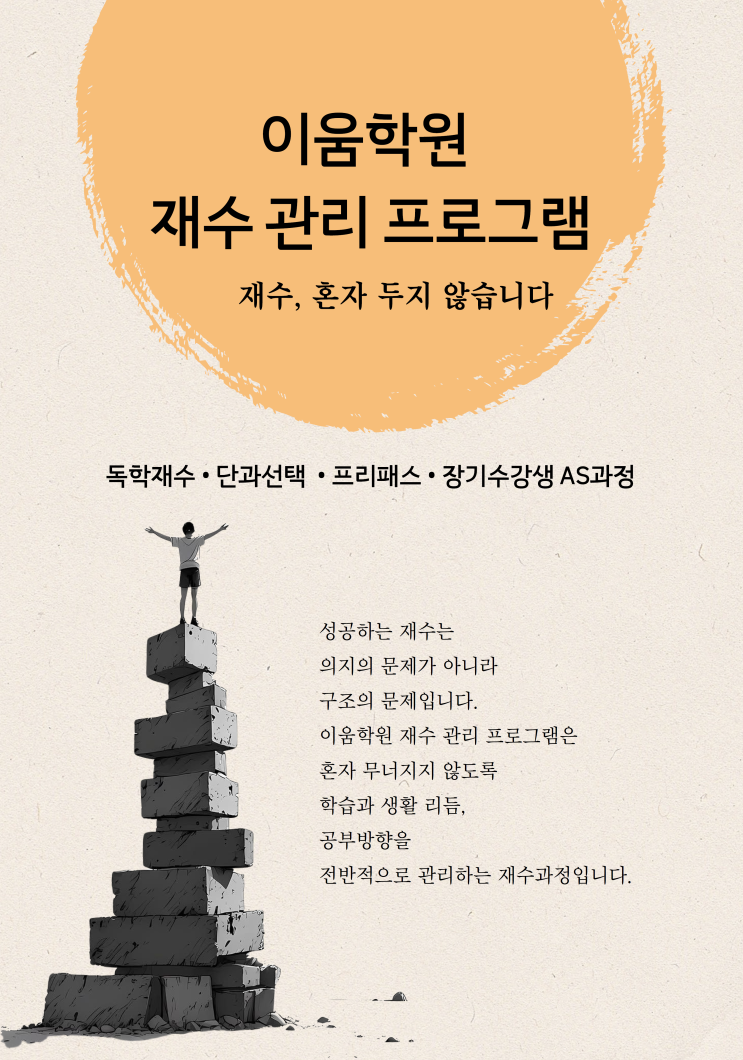 재수, 혼자두지 않습니다. 이움학원 재수관리 프로그램 안내 독학재수 독학재수+단과선택 독학재수+프리패스 재수AS과정 상담문의 031-988-6335 <img src="https://blogthumb.pstatic.net/MjAyNjAxMDZfMjE4/MDAxNzY3NjgwNDI0NzA4.8nNTV2PNUGHmEMbwCtA2rWTdTLuIjThm-HpsNgyQZ0Mg.woxqLrd0SI6uLoYESg-43i8dac4TXln-hOJMCIgmF9og.PNG/image.png?type=s3" />