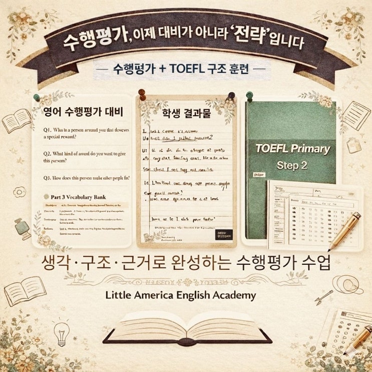 [영어를 배우고 싶게 하는 수업, 수행평가 방학특강 안내] 안녕하세요. 리틀아메리카어학원입니다. "집에 와서 쌤한테 영어 배우고 싶다는 이야기를 지나가면서 하더라구요.ㅎ" 1주차 수행평가 방학특강 진행 후, 학부모님께 전달 받은 소중한 코멘트 입니다. 아침부터 열심히 공부한 우리 학생들을 칭찬합니다.^^ 이번 수행평가 방학 특강은 수업 완성도와 운영 안정성을 고려하여 "금요일" 단일 수업으로 운영 형태를 조정하게 되었습니다. 수행평가 핵심 내용과 TOEFL 시험을 집중도 있게 수업할 예정입니다. ※ 수업 개요 •요일: 금요일 5번 진행 (1/23, 1/30, 2/6, 2/13, 2/27) •시간: 오전 10시~오후 2시 30분, 총 5....... <img src="https://blogthumb.pstatic.net/MjAyNjAxMTlfMjU1/MDAxNzY4ODEzNzg0NTIz.Ga0uzoCCbKPPxAXz4fpBSS0Blo-cks4CYdQ8oDYVn2gg.zUTQfHEwY__rrrXuMqDdVoyc9zYuRb94dOuKCkNkG3Ig.JPEG/%BC%F6%C7%E0%C6%F2%B0%A1%B9%E6%C7%D0%C6%AF%B0%AD.jpg?type=s3" />