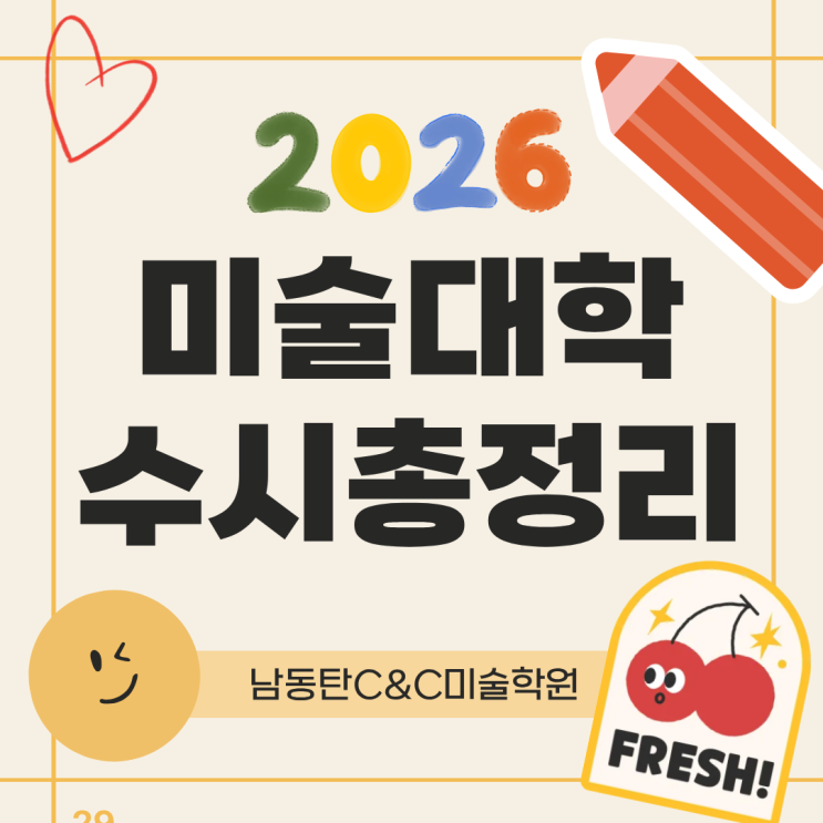 안녕하세요. 동탄미술학원 남동탄씨앤씨미술학원입니다. 1월이 되면서 겨울 특유의 쌀쌀한 날씨로 인해 컨디션 관리가 쉽지 않은 시기입니다. 입시를 준비하고 있는 동탄미술학원 학생들과 학부모님들 모두 건강 잘 챙기시길 바랍니다. 정시가 마무리되는 이 시기에는 동탄미술학원 상담을 진행하다 보면 자연스럽게 "올해 미대입결은 어떻게 나왔을까?" "어느 대학이 가장 경쟁률이 높았을까?" "다들 어디에 가장 많이 지원했을까?" 와 같은 질문을 많이 하시게 됩니다. 하지만 미대입결은 일반 대학 입결과 달리 대학별 학과별 전형별로 매우 다양하게 구성되어 있어 경쟁률과 지원자 수를 한눈에 파악하기가 쉽....... <img src="https://blogthumb.pstatic.net/MjAyNjAxMTdfMTQ3/MDAxNzY4NjE5MTAxNjg5.sW09N-QyrkyqHRk-J_DADgbvDj4iNGmUrRGLcdaQNsIg.6f8jwWIwmq4MelkYjaDFzx0uzaPwqHAs9IDqSxebRskg.PNG/%B5%BF%C5%BA%B9%CC%BC%FA%C7%D0%BF%F8.png?type=s3" />