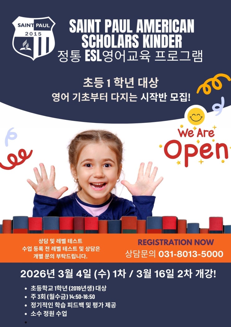 안녕하세요. 학부모님, 세인트폴 동탄 유치부에서 2026년 3월, 초등 1학년을 대상으로 한 "초등 오후반 프로그램" 이 새롭게 시작될 예정입니다. 아이에게 필요한 초등 영어의 기본기부터 차근차근!! 학교 수업 후, 영어 실력을 제대로 키우는 시간이 될 것 입니다. 파닉스 기반 리딩 실력 강화와 말하기 자신감 향상을 목표로 체계적인 커리큘럼으로 운영됩니다. 초등 오후반 모집 ✨ 초등 오후반 수업 특징 ✔️ 파닉스로 읽기 기초 탄탄 ✔️ Speaking 수업을 통한 의사소통 능력 강화 및 자신감 UP ✔️ High Frequency Words 학습으로 읽기 속도 & 이해력 향상 & 리딩 완성 ✔️ 학교 수업과 연계 가능한 안정적인 학습 루....... <img src="https://blogthumb.pstatic.net/MjAyNjAxMjNfMTQ3/MDAxNzY5MTM1MzE1NDM4.r06tFtSrdH7uxWGZqvc38D4h6-w2byl3FiYFoZu78E8g.XeHBWg362cmB3Kpv0geszmwBEyziRZV-78cckPSm0Log.JPEG/%C3%CA%B5%EE%BF%C0%C8%C4.jpg?type=s3" />