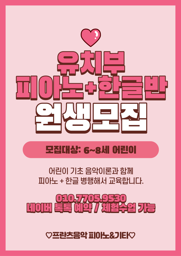 안녕하세요 ㅎㅎ 지난 " 피아노 + 한글반 " 개설 이후 많은 성원에 힘입어 지난번과 같은 클래스의 2차 모집을 진행하게 되었습니다 아래는 저희 원에서 해당 프로그램을 수강한 학생의 연주입니다 ✨모집 대상: 6~8세, 선착순 10명 ✨교육 내용: 음악이론, 피아노, 한글 수업 병행 ✨체험수업 신청 가능 문의사항, 체험수업 신청 등은 하단에 기재한 방법으로 연락 주세요! 저희 원은 늘 관심과 사랑으로 아이들 지도하고 있습니다. 감사합니다 상담문의 010-7705-9530 / 네이버 톡톡 예약 <img src="https://blogthumb.pstatic.net/MjAyNjAxMjdfMTQ5/MDAxNzY5NTA1NDMzNzI5.ZUZRow_Dq5LfMQVEXgTmqRGiF9vUzTK2gWp1rUfdE74g.Npm4yk_0YBUs4-x-8io8GeBnI-O505Ldn4CHW8f-42Mg.PNG/%C1%A6%B8%F1%C0%BB_%C0%D4%B7%C2%C7%D8%C1%D6%BC%BC%BF%E4._%287%29.png?type=s3" />