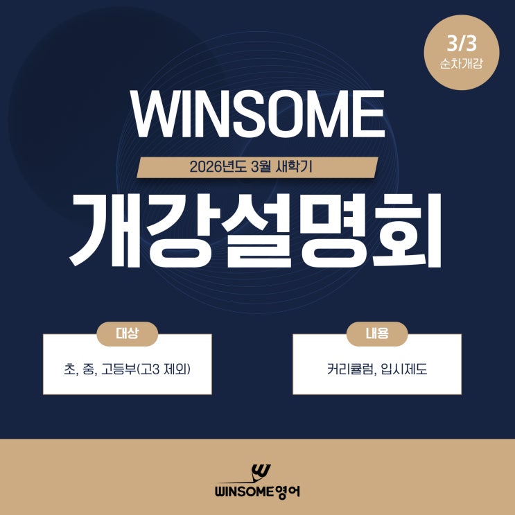 안녕하세요! 윈썸영어학원입니다. 오늘은 3월 새 학기를 맞아 진행되는 2월 개강 설명회 소식을 안내드리려 합니다. 3월은 단순히 새학기가 시작되는 달이 아니라, 학년이 바뀌게 되면서 공부의 기준도 달라지는 시점입니다. 그래서 3월에 어떤 선택을 하느냐에 따라서 한 학기의 흐름이 결정될 수 있답니다! 초등 고학년에서 중등 과정으로, 중등에서 고등 과정을 바라보는 단계로, 고등부에서는 입시를 본격적으로 의식해야 하는 시기로 넘어가게 됩니다. 학년이 올라가면서 단어, 문법의 양과 깊이가 달라지고 ‘이해’ 중심에서 ‘정확도’와 ‘활용’ 중심으로 바뀌며 고학년으로 갈수록 내신·입시와의 연결이 중요해집니다. 그래서 윈썸영....... <img src="https://blogthumb.pstatic.net/MjAyNjAxMjdfMjA2/MDAxNzY5NDk5OTI5Nzky.Yc9onr6U81UWF5SvKfDlJpxiGohtMpHOgFgvruKSS-sg.79yBGcMKwPOyY48wiBEiX5s0iGJvvNvFPdY9zeQQOx0g.JPEG/%C1%A6%B8%F1%C0%BB-%C0%D4%B7%C2%C7%D8%C1%D6%BC%BC%BF%E4_-001.jpg?type=s3" />