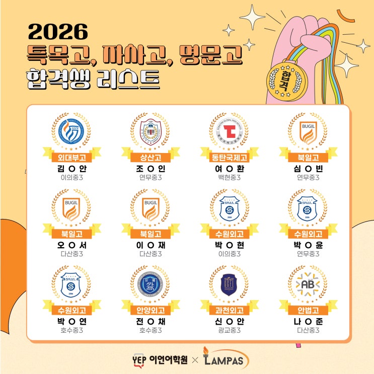 안녕하세요, 이언어학원 광교호수관입니다. 광교 지역 학부모님들께 반가운 소식 전해드립니다. 2026학년도 특목고·자사고·명문고 입시에서 이언어학원 광교호수관 수강생들이 또 한 번 눈에 띄는 합격 성과를 만들어냈습니다 이번 합격 결과는 ✔️ 총 12명의 합격생 ✔️ 다양한 학교에 고른 합격이라는 점에서 더욱 의미가 크다고 볼 수 있는데요! 외대부고, 상산고, 동탄국제고, 북일고, 수원외고, 안양외고, 안법고 등 한 학교에 치우치지 않고, 전국 단위 자사고부터 외고·국제고까지 폭넓은 합격 결과를 만들어냈다는 점이 이번 성과의 핵심 포인트입니다 이언과 함께 새로운 봄을 맞이하고 싶다면? ⬇ ✔️ 결과로 증명하는 광....... <img src="https://blogthumb.pstatic.net/MjAyNjAxMjhfMTAz/MDAxNzY5NTczNTcyMTU4.CmsHw9T-L8OxJ32t4Y53vSgXI5Qhx88zmHx0vsCwTDMg.EMlvQrBdKvHBe0D8tqXQb7I5WI8G1l_BZHITCraJep8g.JPEG/260119_%C6%AF%B8%F1%B0%ED-%C0%DA%BB%E7%B0%ED-%B8%ED%B9%AE%B0%ED-%C7%D5%B0%DD%BB%FD-%C7%F6%BC%F6%B8%B7_%BC%F6%C1%A4_1.out.jpg?type=s3" />