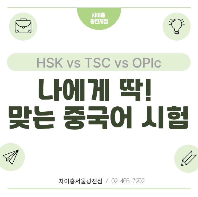 안녕하세요! 차이홍 중국어 광진지점입니다! 중국어는 취업, 유학, 승진, 무역 분야까지 폭넓게 활용되고 있습니다. 하지만 목표 없이 공부하면 동기부여가 약해지기 쉽죠? 그래서 많은 분들이 자격증 시험을 목표로 설정하고 시작하세요. 중국어 시험 종류 막상 알아보려고 하면 HSK, TSC, OPIc 등 다양한 시험이 등장해 어떤 자격증을 취득해야 할지 고민이시죠. 그래서 오늘은 중국어시험 종류에 뭐가 있는지 어떤 자격증을 취득하면 좋은지 정리해 보도록 하겠습니다. 중국어 시험 종류는 뭐가 있을까? 1️⃣ HSK (한어수평고시) 가장 대표적인 중국어 시험 종류 중 하나입니다. 중국 정부에서 주관하는 공인 시험으로 1급부터 6급까지 구성....... <img src="https://blogthumb.pstatic.net/MjAyNjAyMjVfODIg/MDAxNzcxOTUxNTI2MDU0.jmKEixSEmr6fsU9DMNuNkR9k6VS2Yj6d5VwfFmgKQKYg.-WUWt0SlrRmZ0U-POBTO7L37QE3DZ0KjCKuIEoroKlEg.PNG/image.png?type=s3" />