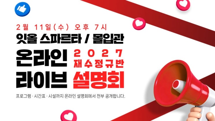 안녕하세요 잇올 스파르타 안양평촌 센터입니다. 온라인 라이브 설명회에 대해 알려드릴께요 수능까지의 전 여정을 함께할 잇올스파르타/ 몰입관의 모든것을 온라인 라이브 설명회에서 전부 공개합니다! 2027학년도 수능을 제대로 준비하고 싶은 학생이라면 이 설명회를 꼭 체크하세요 일정 및 참여방법 일시 2월 11일(수) 오후7시 ♥ 라이브 설명회 참여자 혜택♥ 혜택1 2026년도 이감 시즌6 (추첨50명) 혜택2 2027학년도 수시/정시 전형계획 & 3개년 입시결과 자료 (추첨 100명) 혜택3 학생부/세특관리 학종프로 이용권(10만원 상당) (추첨 100명) 1부- 잇올 몰입공부 시스템 공간 / 생활 / 학습 / 입시 / 콘텐츠 2부- 2027학년도 재수정규....... <img src="https://blogthumb.pstatic.net/MjAyNjAyMDNfMjkw/MDAxNzcwMDc5OTU0NTY3.bx0LiVOETzAHIqB7FjNFiJiLIoXoPJf-jDdp8M2QwXcg.4l7cBjn2Z5dRNDeZe7URQ-EvOcayA_EUtqZVmK4BYMAg.JPEG/%BF%C2%B6%F3%C0%CE1.jpg?type=s3" />