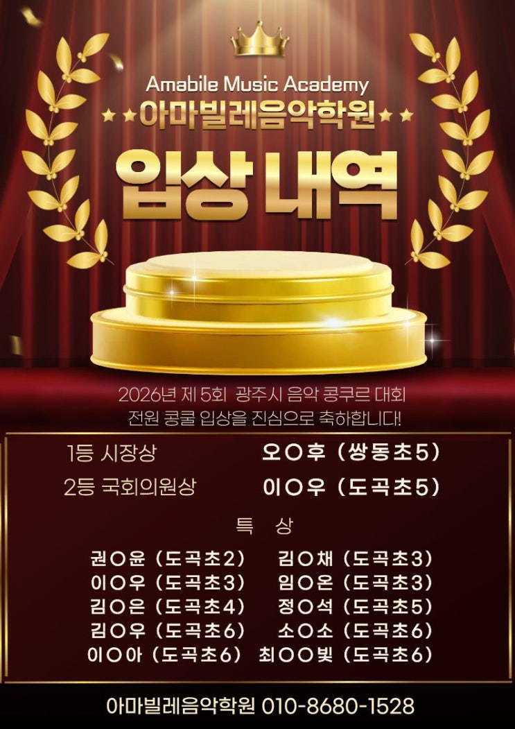 안녕하세요, 아마빌레 음악학원입니다 오늘은 우리 친구들의 콩쿠르 입상 소식을 전해드리려고 합니다! 그동안 꾸준히 연습하며 차근차근 실력을 쌓아온 우리 아이들이 이번 콩쿠르에서 좋은 결과를 만들어냈습니다 단순히 결과만을 위한 연습이 아니라 ✔️ 올바른 손모양 ✔️ 탄탄한 기초 테크닉 ✔️ 음악을 이해하는 표현력 이 세 가지를 중심으로 지도해온 결과, 무대에서도 자신감 있게 연주할 수 있었습니다✨ ⸻ 입상 현황 • 1등 시장상 - 오O후 (쌍동초5) • 2등 국회의원상 - 이O우 (도곡초5) • 특 상 권O윤 (도곡초2) 김O채 (도곡초3) 이O우 (도곡초3) 임O온 (도곡초3) 김O은 (도곡초4) 정O석 (도곡초5) 김O우 (도곡....... <img src="https://blogthumb.pstatic.net/MjAyNjAzMjJfMzgg/MDAxNzc0MTc5ODMwMTc2.Re_B0gQwhnYFevizBi8pZPilcVrEDuNPc_18BOrD0TAg.dt7L5dQnmo15xFc8CDRV67WmaoFUcG7dBMfhGEDkJTEg.JPEG/IMG%A3%DF3075.JPG?type=s3" />