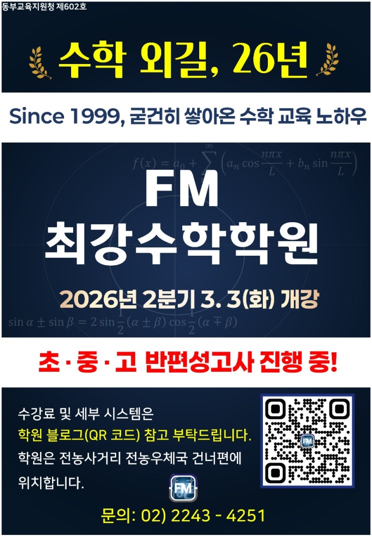 2026년 2분기 3월 3일 개강! 지금 반편성고사 기간입니다. 모집 현황에 따라 일부 반은 조기 마감됩니다. 지금은 반편성고사 기간입니다. 모집 현황에 따라 일부 반은 조기마감됩니다. 각 학년 수준별 반편성, FM최강수학학원의 시스템으로 수업이 구성되어있습니다. *초등부* 1. 26년 전통의 해법수학교실 초등 수학 전문 시스템으로 12월 분기는 다음 학년 1학기 예습이 주된 수업입니다. 2. 초등 3학년부터 진행하는 5단계의 수준별 수업 교재, 7단계 수준별 매단원 평가 시험지가 준비되어 있습니다. 3. 학생 맞춤형 첨삭프로그램으로 구성되어 있는 초등부 프로그램, 토론 발표 수업을 병행하고 있습니다. *중등부* 중등부는 기초부터 심화....... <img src="https://blogthumb.pstatic.net/MjAyNjAyMTJfMTI5/MDAxNzcwODIzNDQ4Njgy.R1ectZvA8w1LDxXKy32cfuZkkYkdbKcQ5yivpc3gklwg.5yhc07Prq6Vy0MqUUniJRUuaBI2jUL8uy61KHBVj_3cg.JPEG/KakaoTalk_20260212_002338711.jpg?type=s3" />