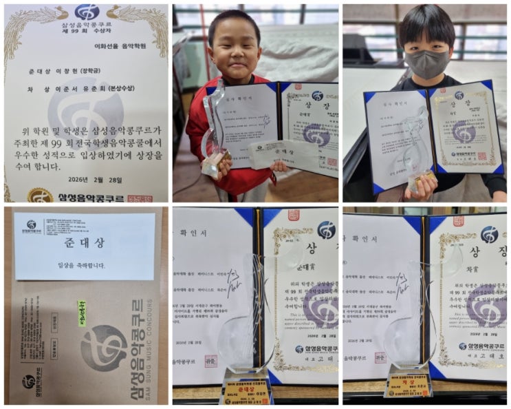 안녕하세요, 이화선율음악학원입니다 이번 봄 콩쿨에서 아이들이 정말 값진 결과를 만들어냈습니다. 총 3명 참가하여 준대상 1명 (장학금 수상) 차상 2명 수상 (본상 수상) 전원 상위 입상이라는 결과를 이루었습니다 상장 & 트로피 도착 아이들이 노력한 시간들이 이렇게 결과로 남으니 지도하는 입장에서도 참 뿌듯한 순간입니다✨ 이화선율은 무엇이 다를까요? 콩쿨은 단기간에 결과가 나오는 것이 아니라 기초 + 습관 + 집중력이 쌓여야 가능한 결과입니다. ✔ 무리하게 밀어붙이지 않고 ✔ 아이 성향에 맞춰 지도하며 ✔ “할 수 있다”는 자신감을 만들어줍니다 그래서 처음 도전한 아이들....... <img src="https://blogthumb.pstatic.net/MjAyNjAzMjhfOTQg/MDAxNzc0NjYxNzAyMTc5.FzX7Iy_qod9WzMadb4Q0L6CjdcihedDp3XamoHA0m4gg._9y6b-kT2pbg9_BMmxnFOi3xAAOS3swe5aV79ui1NV8g.JPEG/900%A3%DF1774661683274.jpg?type=s3" />