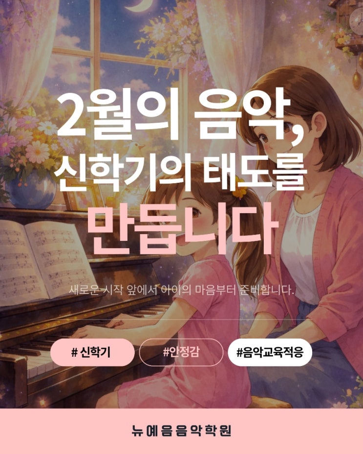 신학기를 앞둔 2월은 아이에게도, 부모에게도 참 복잡한 시기입니다. 새로운 친구, 새로운 교실, 새로운 규칙. 아이의 마음속에는 설렘과 함께 작은 긴장과 불안이 공존합니다. 이 시기에 음악교육을 시작하는 것은 '무언가를 더 시키기 위함'이 아니라 ✅️ 아이의 마음과 태도를 준비시키는 선택입니다. 1️⃣ 음악은 아이에게 가장 먼저 자신감을 만들어줍니다. 연습한 만큼 결과가 나타나고, 조금씩 나아지는 자신의 모습을 스스로 확인할 수 있기 때문입니다. 이 경험은 아이에게 "나는 해낼 수 있다"는 감각을 자연스럽게 심어줍니다. 2️⃣ 음악이 주는 자존감은 타 과목과 견줄 수 없는 깊이를 가집니다. 정답이 하....... <img src="https://blogthumb.pstatic.net/MjAyNjAyMDJfMzQg/MDAxNzcwMDQ0MDU2MTQ1.oGohkejH2eiN7jE5V05rlOHssHEoXOTFw4fEoK4jv9og.9OLLCcu0ekFjARy4E4PCJ_dteJVrwguRuoj_eaW2SBEg.JPEG/900%A3%DF1770043961226.jpg?type=s3" />