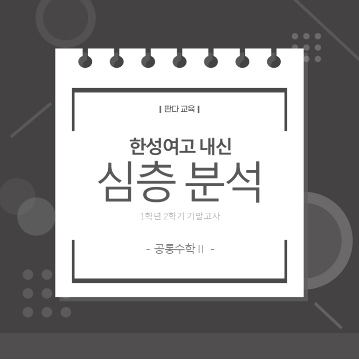 안녕하세요, 판다 교육 학원입니다. 오늘은 한성여자고등학교 1학년 2학기 기말고사, 공통수학Ⅱ 과목 시험에 대해 분석한 내용을 공유해드리려 합니다. 시작하기에 앞서, 판다 교육 학원에서는 어떠한 방식으로 분석을 진행하고 있는 지 또 왜 이러한 분석을 진행하는 지에 대해 간략히 말씀드리고자 합니다. 현재 판다 교육에서는 매 시험마다 어느 교재에서, 어떤 유형으로 출제되었는 지를 파악하기 위한 분석표를 제작하고 있습니다. 분석표 하단에는 앞으로 또 이어질 시험 대비의 방향을 잡기 위해 각 시험에 관한 중요 사항들을 적습니다. 이번 시험에서 학생들이 어떤 어려움을 겪었는 지, 학원에서 시험 대비 기간 동안 진행한 것들 중....... <img src="https://blogthumb.pstatic.net/MjAyNjAxMDlfMjI4/MDAxNzY3OTMwNjc5NTIz.d3HbmaJjt2WFq8SHd-BBamSs9lwMFs73g9uyMKavr0cg.tRABUz3P1fEp4PiUy9ic-ST3QAw2xvboSIwhuWJIs5Qg.PNG/%C7%D1%BC%BA%BF%A9%B0%ED1.png?type=s3" />