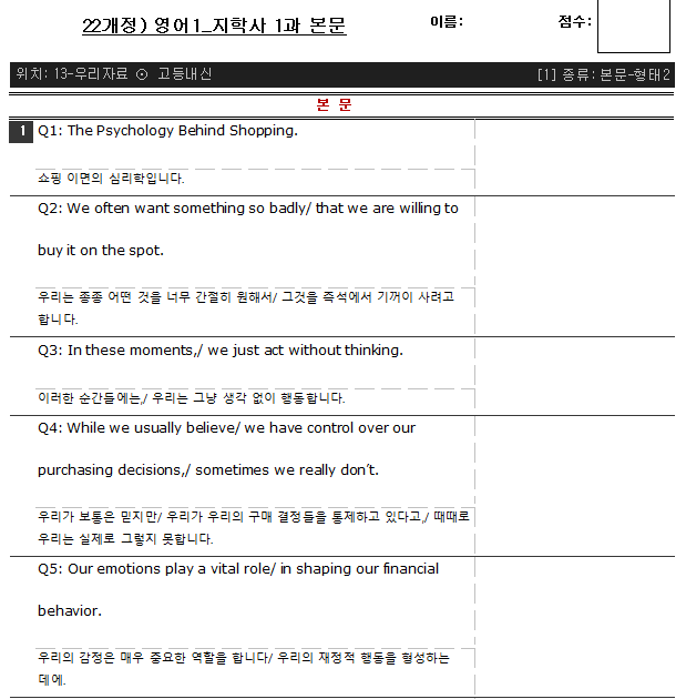 따끈 따끈한 22년 개정 2026년 고2 영어1 지학사 (신상근) 교과서 1과 본문 워크북 pdf를 만들었습니다. 워크북의 구성은 1- 직독직해 본문 2- 의미단위 해석쓰기 3- 의미단위 영작 (힌트) 4- 의미단위 영작 (첫글자) 5- 빈칸채우기- 한영 The Psychology Behind Shopping. 쇼핑 이면의 심리학입니다. We often want something so badly 우리는 종종 어떤 것을 너무 간절히 원해서 that we are willing to buy it on the spot. 그것을 즉석에서 기꺼이 사려고 합니다. In these moments, 이러한 순간들에는, we just act without thinking. 우리는 그냥 생각 없이 행동합니다. While we usually believe 우리가 보통은 믿지만 we have control ov....... <img src="https://blogthumb.pstatic.net/MjAyNjAxMzBfMTI4/MDAxNzY5NzUwOTE5MzEz.mlRdDJQ1f_o_1NsNP1HRoc951fSvHGzJ4QEKxqifzbsg.cuwRVASHXEPqL5cKXQ1FWcJrkNdxXne6zQrlkKzF048g.PNG/image.png?type=s3" />