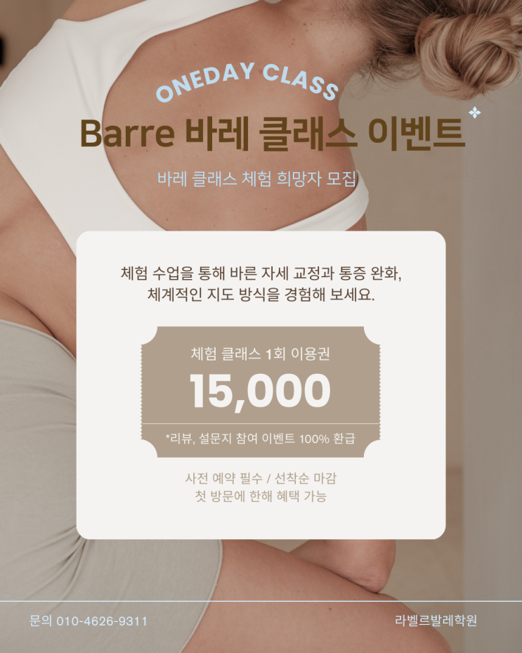 라벨르발레 무료 체험 선착순 안내 바레(Barre) 무료 체험 ✔ 3월 25일 (수) 오전 10시 ✔ 선착순 8명 마감 소수 정원으로 진행되어 한 분 한 분 자세를 꼼꼼하게 봐드립니다. 발레 무료 체험 ✔ 3월 31일 (화) ✔ 선착순 8명 마감 처음 발레를 시작하시는 분들을 위해 더 세심하게 지도하는 클래스입니다. ⚠️ 중요 안내 선착순 인원 마감 시 자동 종료됩니다 현재 문의가 많아 빠르게 마감될 수 있습니다 체험 후 등록까지 이어지는 경우가 많아 지금 신청하시는 걸 추천드립니다 신청 방법 네이버 예약으로 신청 후 원하시는 원데이 클래스를 “이름 / 수업 / 날짜” 문자로 보내주세요! 예시) 홍길동 / ....... <img src="https://blogthumb.pstatic.net/MjAyNjAzMjNfMTMz/MDAxNzc0MjcyOTcyMzg4.bQL0ociBFrXGyusGMc4KNSak3D2_oIRY0oBPC4YH1twg.yU7q5ebrtQ5JkT6yCRDAKDXlMbozeZrZAy3_prYO5ocg.PNG/%BA%A3%C0%CC%C1%F6%BB%F6_%B1%F2%B2%FB%C7%D1_%C7%C7%BA%CE%B0%FC%B8%AE_%C0%CC%BA%A5%C6%AE_%B8%AE%BD%BA%C6%AE_%C0%CE%BD%BA%C5%B8%B1%D7%B7%A5_%B0%D4%BD%C3%B9%B0_%281%29.png?type=s3" />