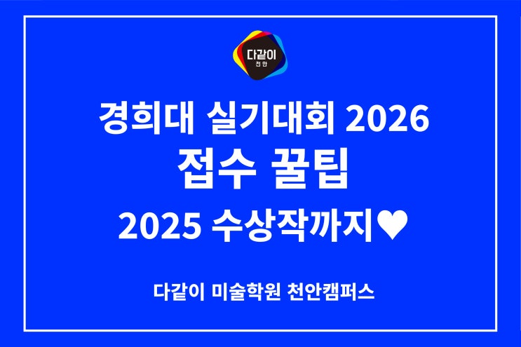 안녕하세요~ 천안 다같이 미술학원입니다. 항상 실기대회 시즌의 포문을 열어주는 경희대! 2026년도 마찬가지로~~~ 경희대 실기대회 접수공고가 벌써 올라왔습니다.^^ 매년 선착순 접수로 3분여만에 접수가 종료되니, 미리 일정을 알아두어야 신청할 수 있겠죠? 경희대 실기대회 기본 정보 일시 2026년 5월 2일 (토요일) ~ 5월 3일 (일요일) 오전/오후 각 2회 (총 4회) [오전] 9:00 ~ 12:00 (3시간) / [오후] 15:00 ~ 18:00 (3시간) 장소 경희대학교 국제캠퍼스 (서울캠퍼스로 오해하면 안됩니다!) 수상자발표 2026년 6월 초 예정 참가비 55,000원 여기서 집중!! 꼭 알아두어야할 주의사항 말씀드릴게요. 접수는 아트앤디자인 홈페이지에서 진행....... <img src="https://blogthumb.pstatic.net/MjAyNjAzMjZfMjgz/MDAxNzc0NDUyNjQyNjE1.5uEcQrXZgWFp1gOxKJmd4uJ6SAm8IiClUad2QNK8Bsgg.EldNdhCN-YJ14SogzEW3s8dESavSfdrIqGVWJu-JecEg.JPEG/%BA%ED%B7%CE%B1%D7%BD%E6%B3%D7%C0%CF%A4%A1%A4%B7%A4%BE-03.jpg?type=s3" />