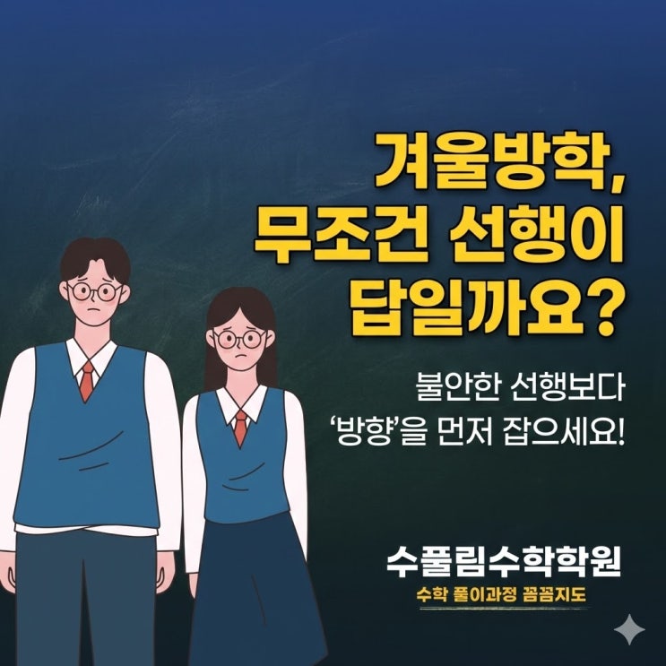 안녕하세요. 수풀림수학학원입니다 :) 겨울방학이 되면 부모님들이 가장 먼저 떠올리는 건 선행입니다. “이번 방학엔 꼭 앞서 나가야 하지 않을까?” “선행을 안 하면 불안한데…” 실제로 은평구수학학원에서 상담을 진행하다 보면 선행 관련 질문이 압도적으로 많습니다. 그런데 흥미로운 건 선행을 이미 하고 있는데도 불안이 줄지 않는 경우가 많다는 점입니다. 그래서 수풀림수학학원에서는 선행을 무조건 권하기보다 부모님들이 가장 많이 묻는 질문을 기준으로 방학 공부의 방향을 먼저 정리해드리고 있습니다. ✅ 질문 1 “선행만 하면 성적이 오르나요?” 가장 많이 받는 질문입니다. 결론부터 말하면 선행만으로 성적이 오르는 경우....... <img src="https://blogthumb.pstatic.net/MjAyNjAxMTZfOSAg/MDAxNzY4NTQyNzI1NDM3.FLdPc4UpryzUrJfDwMgtM4VrLVS0kGa-cRB_Kdtu8FEg.7zabDK0spXv63NpJKal1Oz7KiABtuOQ6Qf7L_I4Hzykg.JPEG/unnamed_%288%29.jpg?type=s3" />