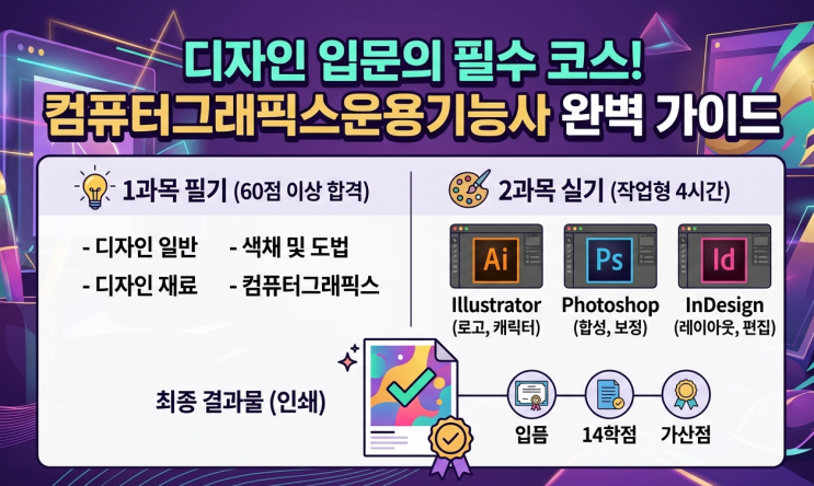 안녕하세요! 오늘은 시각디자인, 광고, 출판 분야로 나아가고 싶은 분들의 필수 스펙, 컴퓨터그래픽스운용기능사 취득법을 정리해 드립니다. 비전공자도 감각만 있다면 충분히 합격할 수 있어요! 필기: 디자인 이론과 기술의 만남 (준비 기간: 1~2주) 필기는 총 4과목이며, 객관식 60문항 중 36문제(60점) 이상 맞히면 합격입니다. 1과목 디자인 일반: 디자인 원리, 요소, 디자인사 (점수 따기 좋은 파트!) 2과목 색채 및 도법: 색의 3속성, 배색, 투시도법 (조금 까다로울 수 있음) 3과목 디자인 재료: 종이, 플라스틱, 인쇄 재료의 특성 4과목 컴퓨터그래픽스: 하드웨어, 소프트웨어, 비트맵/벡터 개념 필기 합격 팁: 디자인 일반과 색채....... <img src="https://blogthumb.pstatic.net/MjAyNjAzMjRfMjIz/MDAxNzc0MzMwMDEyOTg0.KcK8Bp2r_uhZv09TurIeQMuWQCAYW2Pbvfls0BwBfWgg.tO_8EcOPXtgJZuFitP6hc_BLFn4IwTMkavXbTSJYV4Ug.PNG/Gemini_Generated_Image_joxganjoxganjoxg.png?type=s3" />