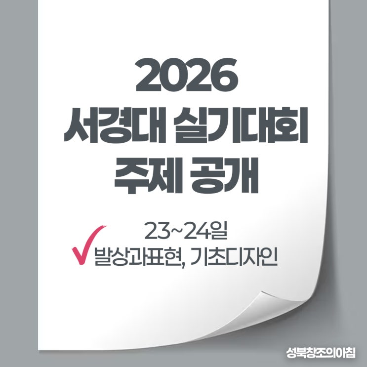 안녕하세요. 성신여대 미술학원 성북창조의아침입니다. 2026년 서경대 실기대회가 시작되는 소식을 저번 포스팅을 통해서 알려드렸잖아요! ▼ 서경대 실기대회 소식 만나러 가보기~ ▼ 오늘은 2026 서경대 실기대회 주제가 공개가 돼서 오늘 소개해드리려고 합니다. 서경대 실기대회는 문제은행이 있는데 해당 문제은행에서 랜덤으로 조합해서 대회 당일에 출제합니다. 서경대는 기초디자인, 발상과표현이라는 실기유형이 있는데 학생이 직접 선택할 수 있어요. 기초디자인이 가장 대표적인 미대입시생들의 실기 유형이기도 합니다. 2026 서경대 실기대회 기초디자인 주제 서경대는 오후, 오전으로 나누어서 하루에 2번 시험을 보는데 시간과 날....... <img src="https://blogthumb.pstatic.net/MjAyNjAzMjdfODkg/MDAxNzc0NTg3MzY5ODY1.B1r0U8dq2stN8_q5vwrbWz5pYo5neLQOx-mpB4d22_Ag.Rm42To7125ncJAQ8WnnGWIZ_Ju5a8h1PSojkHJWxDqwg.JPEG/2026_%BC%AD%B0%E6%B4%EB_%BD%C7%B1%E2%B4%EB%C8%B8_%C1%D6%C1%A6_%286%29.jpg?type=s3" />
