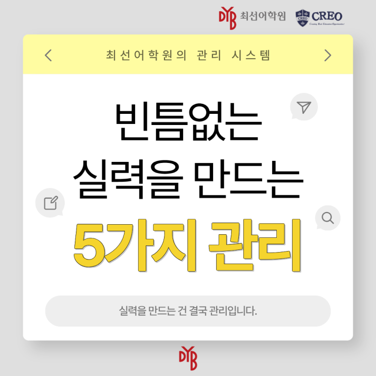 “열심히 하는데, 왜 실력이 그대로일까요?” 수업도 꾸준히 듣고, 단어도 외우고, 숙제도 빠지지 않고 해옵니다. 그런데 어느 순간부터 실력이 눈에 띄게 오르지 않는 구간이 생깁니다. 이때 “더 어려운 교재를 써야 하나?” “수업 시간을 늘려야 하나?” 라고 생각합니다. 하지만 실제 원인은 대부분 다릅니다. 관리의 차이입니다. 영어 실력은 ‘수업’만큼 ‘관리’로 만들어집니다. 좋은 수업은 분명 중요합니다. 하지만 수업은 어디까지나 ‘시작’입니다. 학생이 배운 내용을 얼마나 제대로 이해했는지, 얼마나 반복하고 있는지, 얼마나 정확하게 쌓아가고 있는지 이 과정이 빠지면 실력은 쌓이지 않습니다. 한 번 이해한 것....... <img src="https://blogthumb.pstatic.net/MjAyNjAzMjJfMTM5/MDAxNzc0MTg4MzQ4Mzc0.bI1jZFcyT9c2WlcnkCmJJu_f2441evSAsMDJZuZM8Hkg.yFqCcfOfNe0EzFdo6odKNECgfg6xNPBt3_TXuFuXeKgg.PNG/%C1%A6%B8%F1%C0%BB_%C0%D4%B7%C2%C7%D8%C1%D6%BC%BC%BF%E4..png?type=s3" />