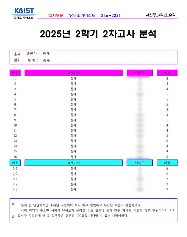 서신중 3학년 2학기 2차고사 수학분석 전주 중★고등 입시수학의 표본인 전주 수학학원 양재호카이스트학원입니다. 이번에는 전주 서신중 3학년의 수학, 2025년 2학기 2차고사를 분석하여 보겠습니다. 위의 내용 중 난이도는 양재호카이스트학원의 내부자료입니다. 그런 이유로 블로그에서는 모두 공개할 수 없음을 양해바랍니다. 학원에 내원하시면 열람가능합니다. ^^ 중화산동 수학학원 양재호카이스트학원에서는 전주에 있는 중★고등학교의 기출을 항상 분석하고 기록으로 남기고 있습니다. 아직 시험을 보지 않은 학생들에게는 좋은 자료가 되고 또한 내년, 내후년에 후배들에게 많은 도움이 되기도 해서입니다. 그리고 시험직전에 시중문....... <img src="https://blogthumb.pstatic.net/MjAyNjAzMjJfMjI4/MDAxNzc0MTY3MzkxNTEx.dENtWDtgEI5QhMdeNfx-zGbEr6u5NdD1Wg60QHSR5zwg.HPc5wm5HkKZ1cS0hm-_uBy0R47CyH9_ePfzrnWXdMvgg.JPEG/%BC%AD%BD%C5%C1%DF3.jpg?type=s3" />