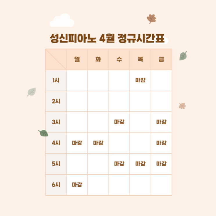 안녕하세요, 성신피아노입니다. 26년 4월 정규시간표 첨부합니다. 기존 재원생 보강시엔 마감타임에도 수업이 가능하지만 피아노를 처음 접하는 신입생 친구들은 비어있는 시간에만 등록을 받습니다. 아이의 충분한 이해와 레슨시간 보장을 위해 양해 부탁드릴게요 :) 수업문의 편하게 주세요! 수업문의 연락처 ⬇️ 학원 인스타그램 ⬇️ 학원 위치 #신금호피아노 #금호동피아노학원 #금북초피아노학원 #금호초피아노학원 #옥수초피아노학원 #응봉초피아노 #금호벽산아파트피아노 #성신피아노교습소 #신금호피아노학원 #성동구피아노 #성동구피아노학원 #신당초피아노학원 <img src="https://blogthumb.pstatic.net/MjAyNjAzMjJfMzMg/MDAxNzc0MTc2ODI0OTc4.5yJAb0-xtnWiZRAM7E-H65VXfuiCIczLKH3fVqevS2og.wPTgCrsLRQh6QZc_TM578zWLeoVlY8cXxN77S6HMjCkg.PNG/IMG%A3%DF2478.PNG?type=s3" />