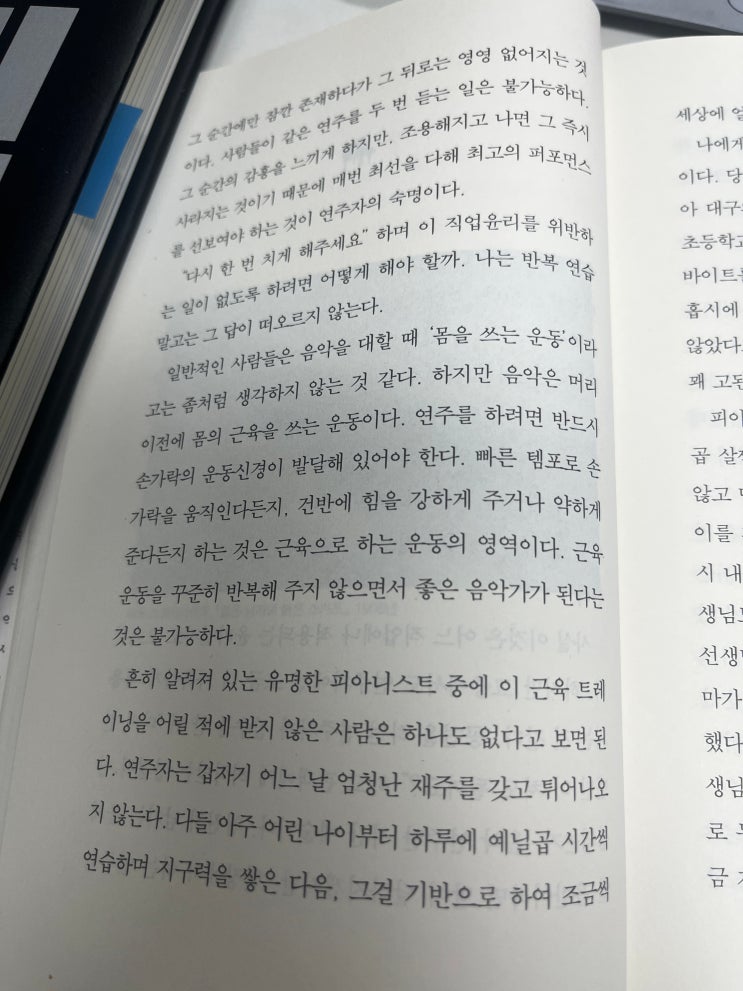 다시 연습이다, 이 이상 할 수 없을 때까지. 배움이 끊기는 날이 인생이 끊기는 날(p.137) 그것에 혼자 창작하고 들려주는 것이 아니라, 남겨진 작품을 재창조해야 하는 연주자로서 더 많이, 더 깊숙이 공부해야 한다. 마땅히 해야할 일이다. 광대한 클래식 피아노 음악의 세계에 발을 들인 연주자라면, 그 폭과 깊이의 한계를 가늠할 수가 없다. 배우면 배울 수록 그 위대한 거인을 재조명하게 될 뿐. 예술가라면 끝없이 음악을 연습하고 연마하는 것이 진정한 삶의 의미를 찾는 길이다. 자기 연마만으로 만족하는 것을 거듭하며 어느 순간 한계에 봉착해 '이제 진짜 끝인가 보구나' 할 즈음이면, 생각지도 못한 곳에서 기회가 등장하....... <img src="https://blogthumb.pstatic.net/MjAyNjA0MDJfMjY4/MDAxNzc1MTMxMjUyNjE0.BL_fnUqKcSLeaoLPHCPS89clQhBch2C5cXwCVFUTg5kg.ZrzGXS-mTqIBLO-PRFgw5-17k2v8AjSKXFQ3y2UBdygg.JPEG/IMG_7478.jpeg?type=s3" />