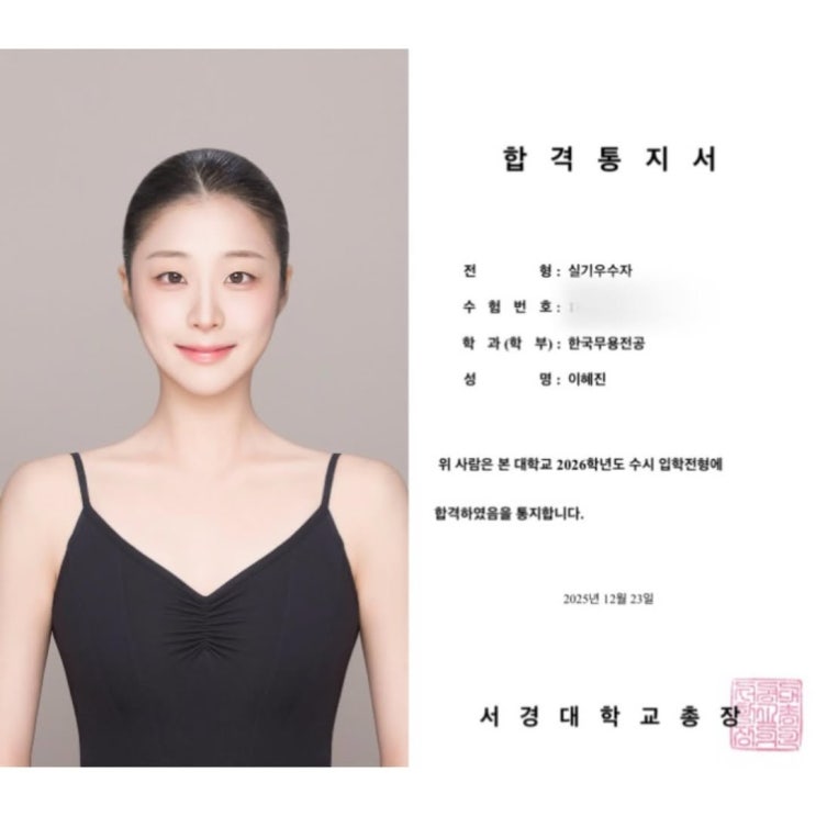 '수시 서경대학교 무용학과 합격' 2026년도 서경대학교 무용학과 수시 합격을 축하합니다. 2025년 1월 1일 시작하여, 10개월만에 좋은 소식을 알려드려요 정시까지 바라보고 입시를 준비하고 있었는데 뜻하지 않게 수시에서 감사한 소식을 받았어요. *^^* '수시 서경대학교 무용학과 합격' 다시 한번 축하해~ ♥♥♥ 혜진이의 장점을 뽑자면 1. 입시날 컨디션 좋았아요~!! (긍정의 아이콘이랄까..) 2. 본인에 맞는 다이어트를 잘 찾아냈어요~!! 3. 꾸준한 방법으로 본인에게 맞는 몸풀기를 잘해요~!! 10개월이라는 시간을 잘 버텨준 우리 혜진이 칭찬해 역시 긍정과 성실, 노력은 입시합격의 가장 큰 키워드~!! 앞으로 더욱....... <img src="https://blogthumb.pstatic.net/MjAyNjAxMTRfNzYg/MDAxNzY4MzYxNDAzMTQ5.jH1V01RmPjpJf71sWHdXWTi5Kv-CbT33MSFHXm7qQ9Ag.8SQFgnwt9FsruFOOUah5JnRuPhtAY9UWdRCbRaP--ekg.JPEG/%BC%AD%B0%E6%B4%EB%C7%D0%B1%B3_%C0%CC%C7%FD%C1%F8.jpg?type=s3" />