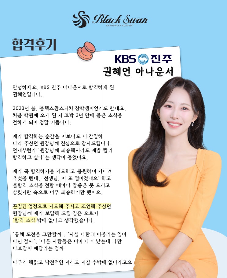 #KBS진주아나운서 #합격후기 오늘 하루도 고생하셨습니다. 2026년 1월도 벌써 중반부를 달려가고 있네요. 2026 KBS진주 공채 아나운서 합격생 혜연 학생이 소중한 합격 후기를 보내줬답니다. 함께 한 인연이 3년, 그리고 지난 2025년 정말 치열했던 100일간의 시간들, 오롯이 이렇게 좋은 결과로 이제는 지상파 아나운서로서 새로운 인생 2막을 열게된 혜연 학생에게 진심으로 축하의 마음을 보냅니다. 아나운서 준비생 여러분들, 정말 많은 고민이 있을 거예요. 하지만, 2026년 다시금 마음을 새롭게 붙잡고, 하나씩 하나씩 하면 반드시 그 끝이 보일 거랍니다. 블랙스완스피치가 여러분과 함께 할게요. 2026년 새해 복 많이 받으세요. “우리가....... <img src="https://blogthumb.pstatic.net/MjAyNjAxMTZfOTIg/MDAxNzY4NTU2MzY3ODU3.A49sNOCu0l8jPpw0P6WgKOEybKsfJQhZSm0gRuBkzPkg.3r_vjWbVR-dLrVcJm2swg1wVztI2d0LHupiZaKGYQKwg.JPEG/%B1%C7%C7%FD%BF%AC_%C7%D5%B0%DD%C8%C4%B1%E2_1.jpg?type=s3" />