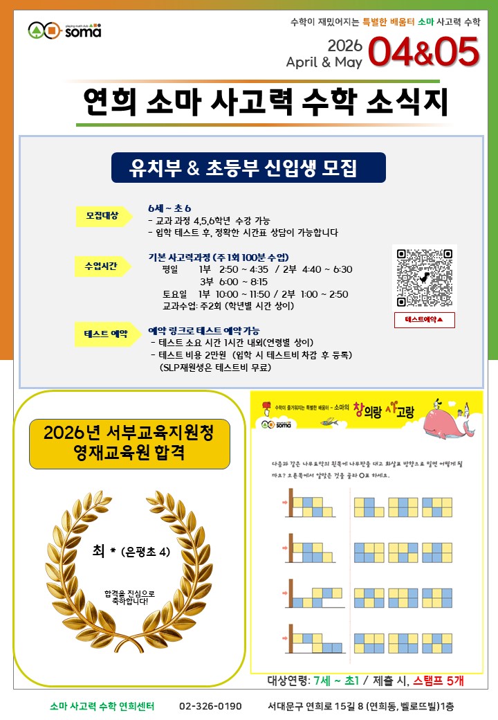 안녕하세요. 연희소마 4&5월 소식지입니다. 수학을 쉽고 재미있게 시작할 수 있는 연희소마사고력수학학원입니다. 6세부터 초등부까지 다양한 연령과 레벨의 반이 운영되고 있습니다. 사고력수학, 교과수학까지 시작부터 차이나는 서대문 연희소마에서 신나고 재미있게 수학을 배워요. 소마사고력수학 연희센터 입학테스트 예약 아래 링크로 들어가셔서 원하시는 날짜와 시간을 선택해 주시면, 관리자 확인 후 예약 확정 문자를 보내드립니다. https://sdmyhsomares.somai.co.kr/front/reservation_detail?caller_type=cardtype&proxy_mem_id=&product_id=00000000000000010568 <img src="https://blogthumb.pstatic.net/MjAyNjAzMjFfMTYz/MDAxNzc0MDU3OTIxNzcy.AH-tG1cFaIttIoPh7SVoYZPaPyhoCv89zGCdXx7j8KEg.vEbX8T6ZNbXdHJ8TliTQ3JUWrNYxDxB-LETs5zLvm-4g.JPEG/%BD%BD%B6%F3%C0%CC%B5%E51.JPG?type=s3" />