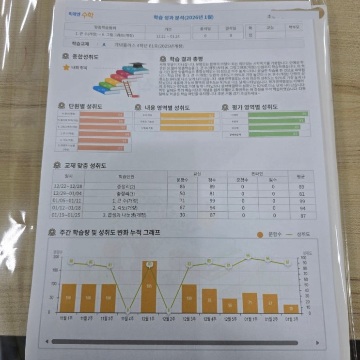 “한 달 동안 이렇게 성장했어요!” — 1월 학습 교재·시험지·학습분석표 가정 발송 안내 — 군산 나운동 미래엔 영어·수학 EM스쿨학원입니다 오늘은 아이들이 한 달 동안 어떤 학습을 했고, 얼마나 성장했는지를 한눈에 확인할 수 있는 학습 패키지를 가정으로 보내드렸습니다. ✨ 한 달 동안의 노력이 한 묶음으로! 교실에서 열심히 공부한 흔적들이 고스란히 담긴 ✔ 교재 ✔ 테스트지 ✔ 오답노트 ✔ 학습성장분석표 까지 모두 패키지로 정리해 보내드렸어요. 사진만 봐도 아이들이 얼마나 집중해서 배웠는지 느껴지시죠? 특히 매주 진행되는 개념학습과 단계별 문제풀이, 그리고 학습량·성취도 그래프는 ‘이번 달 우리 아이가 어디까....... <img src="https://blogthumb.pstatic.net/MjAyNjAyMDFfNDkg/MDAxNzY5OTQ2NzY0MTQw.JPymY0BiFKus-8PdV9Qw9MrfwP4p9-KshvJlfAwEip8g.vU2MI9t4c0Aympj6ZH7GTgXuFRspRA5lLSmqbJ6kwXgg.JPEG/900%A3%DF20260130%A3%DF144212.jpg?type=s3" />