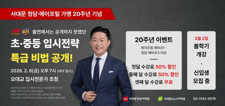안녕하세요, 서대문 청담/에이프릴 어학원입니다! 저희 학원이 서대문 지역 학부모님들의 신뢰와 사랑 속에 어느덧 가맹 20주년을 맞이했습니다. 그 감사의 마음을 담아, 어디에서도 듣기 힘든 역대급 입시 세미나를 준비했습니다. 방송에서 차마 다 공개하지 못한 초·중등 입시 전략! tvN STORY 〈일타맘〉, MBC 〈공부가 머니?〉 등 수많은 방송을 통해 입증된 25년 차 입시 전문가, 오대교 대표가 직접 서대문을 찾아옵니다. 이런 분들이라면 꼭 참석하세요! 특목고, 자사고 진학을 고민 중인 학부모님 변화하는 입시 제도 속에서 우리 아이만의 로드맵이 필요하신 분 초등부터 대입까지 이어지는 확실한 학습 전략이 궁금하신 분 세....... <img src="https://blogthumb.pstatic.net/MjAyNjAxMTNfMTgx/MDAxNzY4Mjk5NjQyNzM1.XzJoG0nLruaV82ZLN6jheaStikRK8v9ivRlXLO5tA7kg.Uq8R1COxoEqHTy0wt4h0_7fw5O5e2VuVE8wG35LLYdsg.JPEG/260113_%BA%BD%C7%D0%B1%E2%C7%F6%BC%F6%B8%B7_1900_900.jpg?type=s3" />