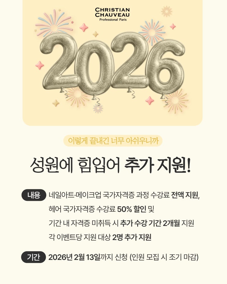 2026년을 맞아 미용 국가자격증 취득을 목표로 준비 중인 분들을 위해 관악구미용학원에서 기획했던 미용 국가자격증 수강료 지원 이벤트에 정말 많은 관심과 문의가 이어지고 있어요 ⇣⇣ 수강료 지원 이벤트 안내 ⇣⇣ #네일아트 #메이크업 #헤어 #국가자격증 취득을 준비 중인 분들께 실질적인 도움이 되길 바라는 마음으로 준비한 이벤트였는데 예상보다 빠른 신청 속도로 인해 이미 마감된 건가요? 라는 문의가 굉장히 많이 들어오고 있습니다 이에 관악구미용학원에서는 여러 분들의 성원에 힘입어 각 이벤트당 두 명씩 추가 모집을 결정하게 되었습니다 파격적인 수강료 지원 이벤트 문의와 함께 정말 제가 합격할 수 있을까요? 라는....... <img src="https://blogthumb.pstatic.net/MjAyNjAyMDNfMTA1/MDAxNzcwMTEwMDIyOTky.UngbmAY5N7mQUH-GmNPMTRX52V-LYbuYdQET-wVKV38g.b_BVSptllZ5ENew3ux76BFFNUSVs5j50qAMJ_Ugc9ocg.JPEG/4-%BC%BC%B9%EE%B5%B7_%C0%CC%BA%A5%C6%AE.jpg?type=s3" />