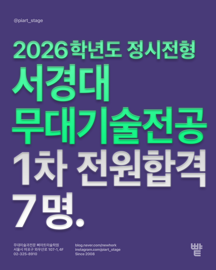 서경대 1차합격을 진심으로 축하합니다. 삐아트미술학원에서는 서경대 무대기술 입시에 특화된 수업을 진행하고 있습니다. 다년간의 노하우로 무대과 출신 전문강사진이 무대모형제작부터 2차 면접까지 책임지고 성실히 지도합니다. 축하합니다 뺱 https://www.instagram.com/piart_stage/ <img src="https://blogthumb.pstatic.net/MjAyNjAxMTJfMTQ2/MDAxNzY4MTg1OTY1NDE5.c-itRe2YnmCeT78da1qHGrPgaGZBDru0l5gpiG1CeFIg.VnFniSIIBYV3dyLrI3MrEjcRnyG6vy8_FERrBkMTp6kg.PNG/KakaoTalk_20260112_023853894_01.png?type=s3" />