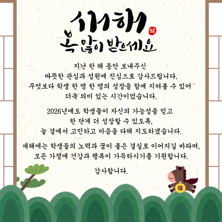 겨울방학입니다. 이전에는 겨울방학 후 개학 후 종업을 하고 다시 봄방학을 했죠. 요즘에는 방학식 겸 종업식, 졸업식을 함께 하고 3월2일 개학을 하는 학교들이 많아졌습니다. 길어진 겨울방학.. 알차게 새학기를 준비하기위해 선행에 매진하는 경우들이 많이 있습니다. 그러나 선행에 앞서, 꼭 확인해주세요!! 이전 학기의 학습이 잘 이루어졌는지. 학습결손이 생기진 않았는지.. 특히 수학의 교육과정은 나선형으로 이루어져 기초부터 시작하여 단계적으로 내용의 깊이가 더해지기에 이전 학습 내용이 이후 학습에서 큰 역할을 하고 있습니다. 중,고등 학습을 위해서 초등수학은 중요합니다. 새학기가 시작되기 전 꼭 확인해주세요!! 새학년을....... <img src="https://blogthumb.pstatic.net/MjAyNjAxMTlfMjEy/MDAxNzY4Nzg2NTQ4OTMx.-lGAjRbIm-tsgzKkoEONPTYxCUkPtRZLqWz3PpHaWQgg.RIQi7Pt0MmmGoT1UAaaUlEKynCMwkUR1Q-_g33VT8a8g.PNG/900%A3%DF1767080382870.png?type=s3" />
