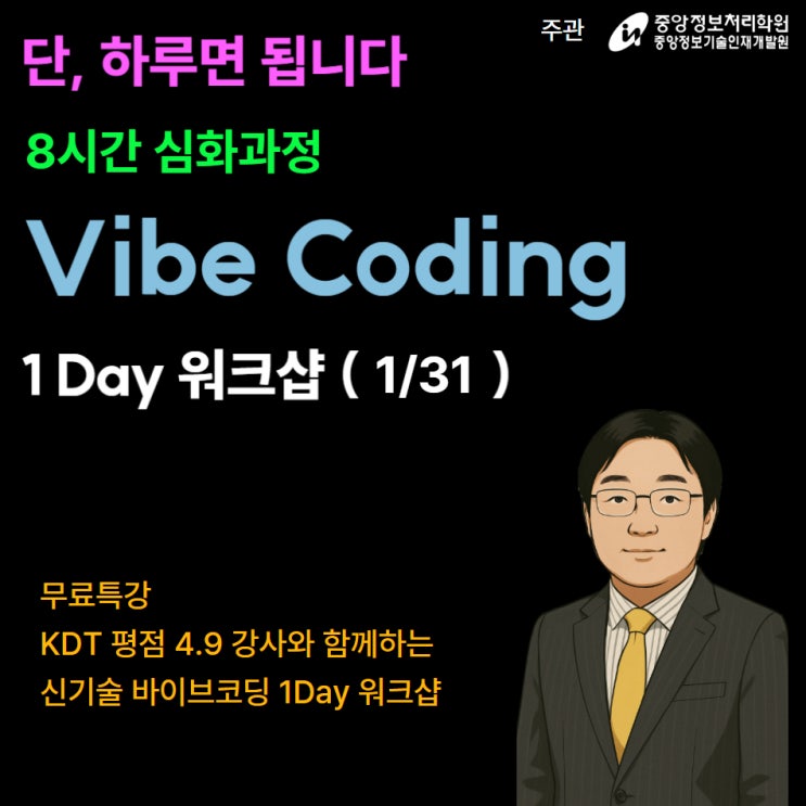바이브 코딩 심화과정이란? 바이브 코딩 심화과정은 생성형 AI 코딩 도구를 실제 개발 흐름에 적용하는 방법을 다루는 1일 집중 특강입니다. 프롬프트 입력 → 결과 확인 ❌ AI 결과를 읽고 분석, 수정, 확장 ⭕ 즉, AI 코딩 입문 이후 단계, KDT·개발자 과정 진입 전 브릿지 교육에 해당하는 과정입니다. 이런 분들에게 최적화된 AI 코딩 특강 바이브 코딩을 이미 한 번 이상 사용해보신 분 AI가 만든 코드가 이해되지 않아 불안한 분 코드 구조를 알고 직접 수정하고 싶은 분 생성형 AI를 실무·취업 관점에서 활용하고 싶은 분 K디지털트레이닝 (KDT) 과정 수강 전 방향을 잡고 싶은 분 완전 초보 체험형 특강이 아닌, AI 코딩 심화 교육....... <img src="https://blogthumb.pstatic.net/MjAyNjAxMjBfMTIx/MDAxNzY4ODk3ODI1Mzg4.hfoULmYk8wcDRVMmpyy7mFNSw8M0HET9DFzu8b3BVrUg.8Be_Bq0y1mQQp2D4lJHnHkrF1NazErZUj_8t_mk_UnAg.JPEG/1%BF%F9_%B9%D9%C0%CC%BA%EA%C4%DA%B5%F9_%BD%C9%C8%AD%B0%AD%C0%C7_%BD%E6%B3%D7%C0%CF.jpg?type=s3" />
