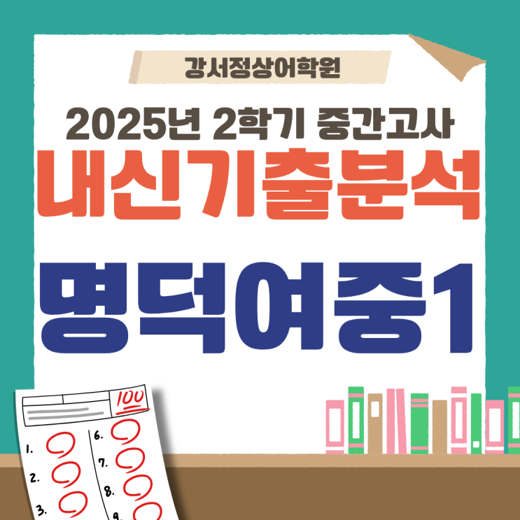 안녕하세요, 강서정상어학원입니다. 2025학년도부터 중등 1학년 영어 내신 시험이 전면 시행되었습니다. 이제 중1은 더 이상 ‘적응 기간’이 아닌, 내신 성적 관리가 본격적으로 시작되는 첫 출발점이 되었습니다. 특히 중등 영어 내신은 학교별 출제 경향, 기출 유형, 서술형·수행평가 비중에 따라 성과 차이가 크게 벌어지는 구조이기 때문에 기출 분석 없이 안정적인 고득점을 기대하기는 어렵습니다. 그렇다면, 중등 1학년 내신 대비는 어떻게 준비해야 할까요? 정상어학원 강서분원에서 중1 영어 내신 대비의 핵심 전략과 학교별 기출 분석 포인트를 안내드립니다! 명덕여중 기출 분석 한 줄 요약 명덕여자중 1학년 2학기 영어 중간고....... <img src="https://blogthumb.pstatic.net/MjAyNjAxMTZfNzkg/MDAxNzY4NTQ0MjE2MDgy.Iwa7HLqpGU4LrEEuI4C4jBGU5jN54pPUzCJpAduLkAgg.HIT350BYoo-ImUm7GDEH960rcFisvSJbtzw411nC6jMg.PNG/25.png?type=s3" />