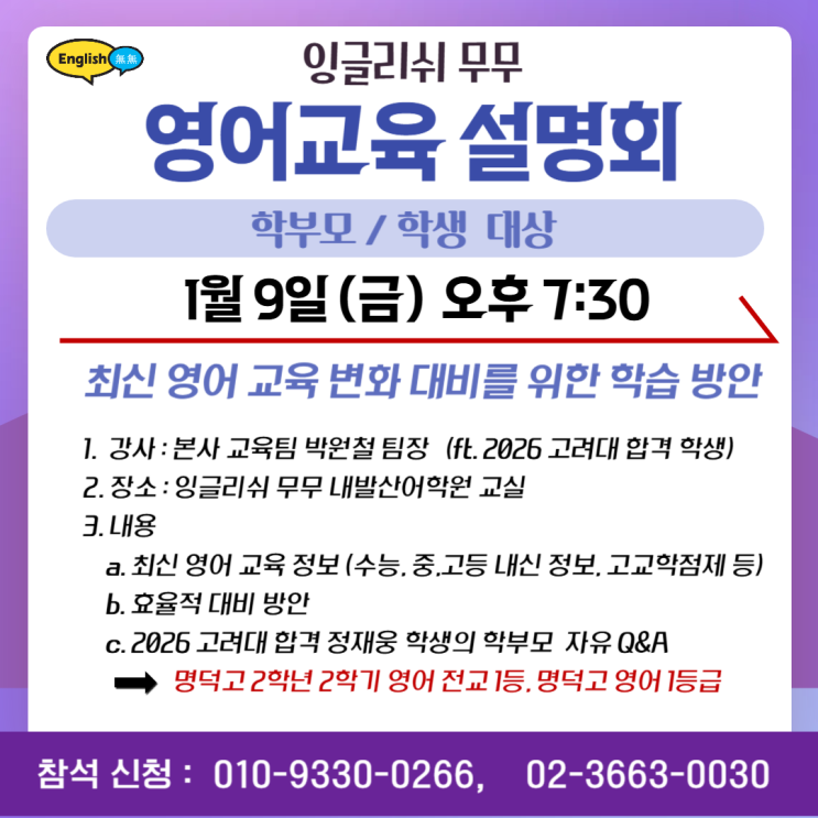 ☞ 고려대 합격생 자유 Q&A 함께 진행 변화를 정확히 알아야 확실한 대비 가능합니다. 최근 중, 고등 공교육 출제 경향 등 최신 영어 교육 정보와 대비법을 잉글리쉬 무무 본사 교육팀장이 알려드리는 영어교육설명회가 진행됩니다. 아이들과 소통 및 미래 대비에 도움될 다양한 내용 전달되니 학생과 함께 신청하세요. 영어에 관심있는 분 모두 참석 가능하니 일정, 연사, 내용 등 세부내용 확인 후 신청 바랍니다. <img src="https://blogthumb.pstatic.net/MjAyNjAxMDVfMjk0/MDAxNzY3NTQxMTAwMTc5.9Pt-og3fH9f0mXosh1HE6cZhs4fOmmrYJLVeNU3FDqwg.FVMTVeY4vs1mdJwoZXW_VVZEEEZi6EcXrSt3j5wtJwMg.PNG/%BD%C5%C3%BB_%C0%CF%B9%DD.png?type=s3" />