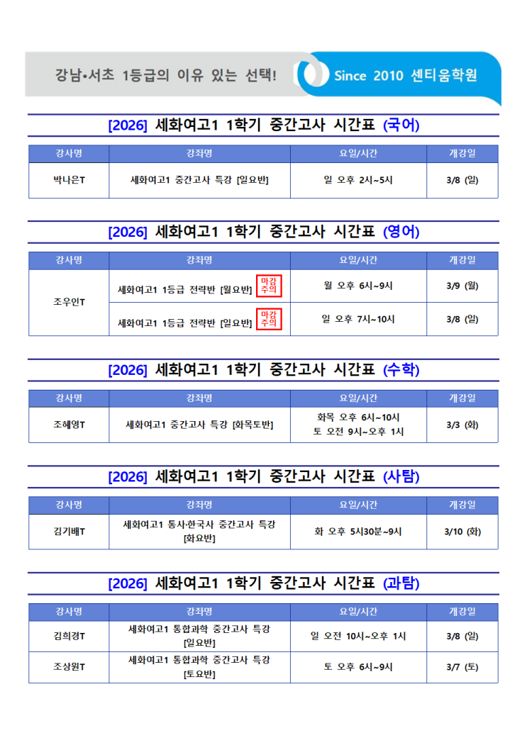 [2026 세화여고1] 1학기 중간고사 시간표 (2/1 수정)