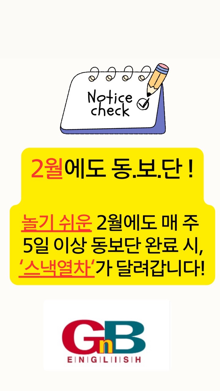 공부 루틴의 힘 영어 공부, 어떻게 하면 잘할 수 있을까요? 정답은 멀리 있지 않습니다. 매일 꾸준히 하는 공부 루틴 지금까지 용황지앤비 학생들은 스스로 목표를 세우고 끝까지 해내는 멋진 모습을 보여주었습니다 그 노력에 박수를 보내며, 더 즐겁게 도전할 수 있도록 동기부여 이벤트를 준비했습니다 ~ EVENT ① 스낵열차 출발! 2월 한 달 동안 ✅ 매주 5일 이상 동보단 완료 시 여러분의 교실로 ‘스낵열차’가 달려갑니다! 꾸준히 해낸 노력, 작은 보상이지만 진심을 담아 응원합니다 ✂️ EVENT ② 행운의 가위손! 단어시험 결과 이벤트 2주 동안 3번 100점 달성한 반 ?....... <img src="https://blogthumb.pstatic.net/MjAyNjAxMjhfMTA0/MDAxNzY5NjA4NDI4ODA4.ap-OrQNgBGnq0Q6J73BV41DmK-G5S9Au0a5JV1qSs40g.HXZpdnqrSfkL2aH3ChoJXXhtkF2OTq67VvI-JG6uNi0g.JPEG/5F42C9B9%A3%ADFE33%A3%AD4EEB%A3%ADB3CC%A3%ADBC4291A105F4.jpg?type=s3" />