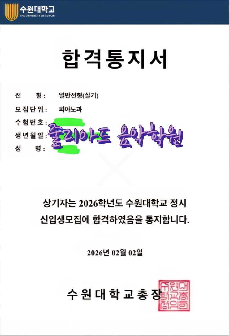 [축]2026 수원대학교 피아노과 정시 최초 합격을 축하합니다