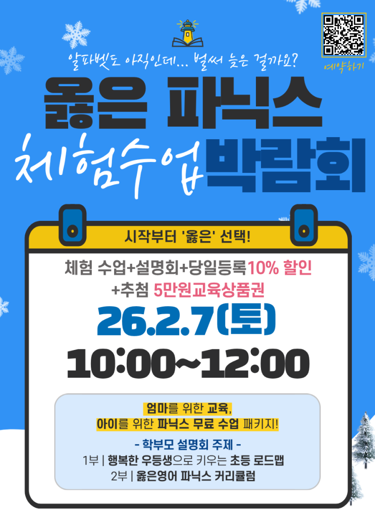 안녕하세요, 옳은영어입니다! 지난 25년 12월, 5차로 진행된 파닉스 무료 체험 수업 박람회가 성황리에 종료되었는데요! 금번 2월 7일 (토) 에 6차 가 진행될 예정에 있습니다. 파닉스가 어려운 초등학생이라면 누구나 참석이 가능합니다. 2026년 초1이 되는 학생부터, 고학년까지! 파닉스가 어려웠다면?!! 옳은 파닉스 무료 체험 수업 박람회에 참석하여 파닉스를 재미있게 배우는 경험과 함게 영어학원에 대한 두려움을 버리고 이번을 계기로 영어 공부를 즐겁게 시작하면 얼마나 좋게요? :) 게다가, 이번 박람회에는 파닉스 체험 수업 뿐 아니라, 학부모님을 위한 초등 로드맵 안내 및 파닉스 레벨에 대한 커리큘럼 설명회가 동시에 진행됩니....... <img src="https://blogthumb.pstatic.net/MjAyNjAxMTNfMjI0/MDAxNzY4MzA1OTMyNDI5.6Kd9mhgeQJh1RKN2oW4A8cycBf4ETGk88sspAeYIFkUg.tjRi8ltrnGoSrpPWCJxojshGjCFFXIzJMDuhSnJQGAAg.PNG/3.png?type=s3" />