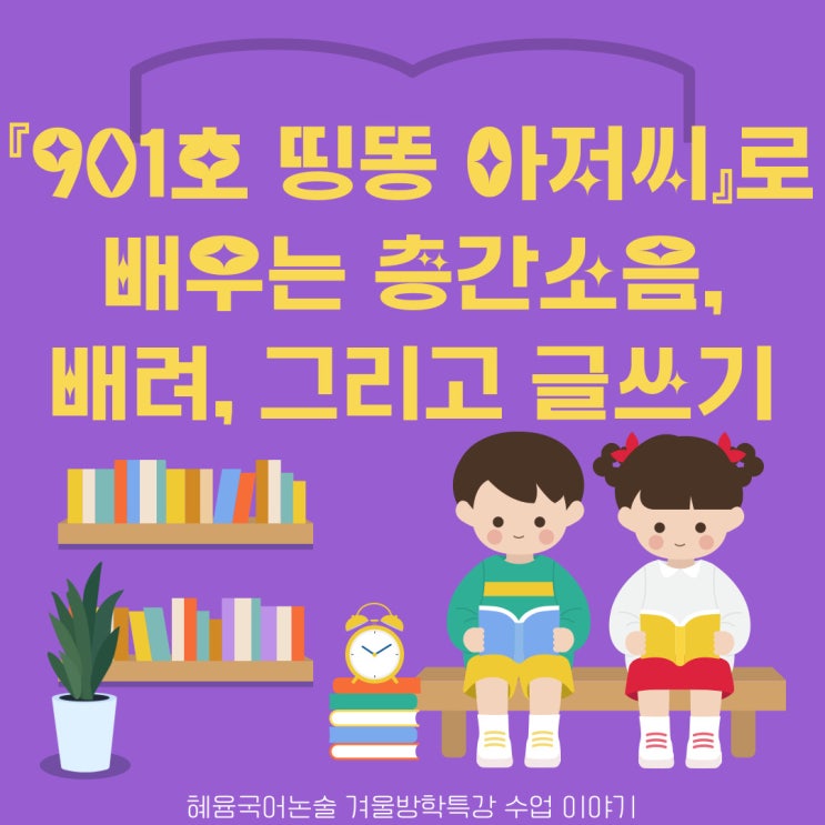 『901호 띵똥 아저씨』로 배우는 층간소음, 배려, 그리고 글쓰기 — 혜윰국어논술 겨울방학특강 수업 이야기 아이들과 국어 수업을 하다 보면, ‘글을 잘 쓰는 것’보다 더 먼저 길러야 할 것이 무엇일까 고민하게 됩니다. 혜윰국어논술이 겨울방학특강에서 선택한 책, 바로 **『901호 띵똥 아저씨』**입니다. 이 책은 아이들이 일상에서 충분히 겪을 수 있는 층간소음이라는 소재를 통해 ‘가해자와 피해자’, ‘갈등’, 그리고 ‘배려’라는 중요한 주제를 다루고 있습니다. 하지만 이 이야기는 단순히 “조용히 해야 한다”는 교훈으로 끝나지 않습니다. 서로의 입장을 생각해 보는 힘, 그리고 함께 살아가는 공동체에서 우리가 지켜야 할 태....... <img src="https://blogthumb.pstatic.net/MjAyNjAxMTRfNDkg/MDAxNzY4MzY0NjE3ODM2.mtNxE1thy5QheKE1jiNGZlWFj2_DhNfI2ldeJq2aBewg.IrejUlvQRj11GtoCPdspBZJy1f0RagBeUZWicJgs-W4g.JPEG/001.jpg?type=s3" />