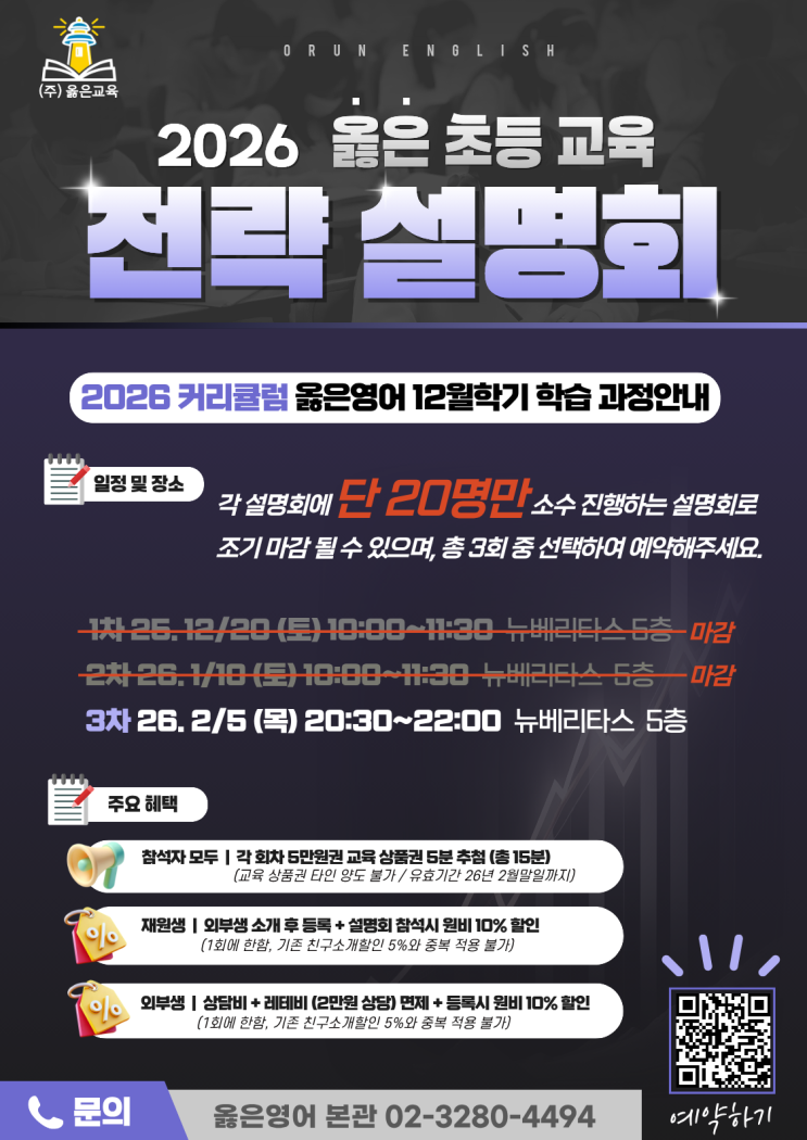 안녕하세요, 옳은영어입니다! 12월 20일 1차, 1월 10일 2차에 걸쳐 진행된 초등부 전략 설명회 및 프로그램설명회가 학부모님들의 많은 관심속에 선착순 마감되었습니다. ⬇25년 12월 20일 1차 설명회⬇ ⬇26년 1월 10일 2차 설명회⬇ 참석하신 학부모님들께서 도움이 많이 되셨다는 의견을 주셨습니다~!! 오는 2월 5일 저녁 8시 30분에 3월 학기전, 마지막 제 3차 전략 설명회 가 있습니다. 이번 설명회는 '풍성한 혜택'이 있다는거 들어보셨죠? 1. [리뷰이벤트] 행운의 주인공 5분! 5만원권 교육 상품권 추첨 2. [재원생 부모님] 추천 감사 혜택 (외부생 소개 후 등록 + 설명회 참석 시) 원비 10% 할인 3. [신입생 부모님] 입학 지원....... <img src="https://blogthumb.pstatic.net/MjAyNjAxMTZfMTg2/MDAxNzY4NTYyMTg0NDM4.yOZgrw2lddKVu382hlLZKHEfuMTPIyPjc25TVY8eP7kg.eMO4voJeKGd-lPEuS6c7_tsHh5E76_baXjsWp5rCciUg.PNG/2026_%BF%C7%C0%BA_%C3%CA%B5%EE_%B1%B3%C0%B0_%C0%FC%B7%AB_%BC%B3%B8%ED%C8%B8_%282%29.png?type=s3" />