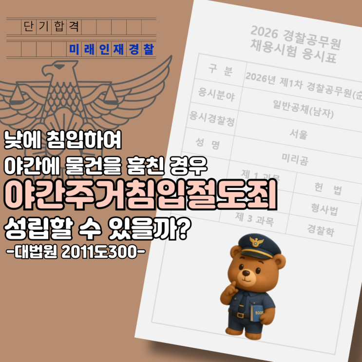 안녕하세요, 미래인재경찰입니다. 요즘 미세먼지가 많아서 날씨가 많이 흐린데요, 시험이 얼마 남지 않은 만큼 건강 관리를 필히 하셔야 합니다! 모두 마스크 착용하시고 감기에 걸리지 않게 유의하세요.^^ 그럼 오늘 준비한 판례를 소개하도록 하겠습니다. 낮에 침입하여 밤에 물건을 훔친 경우에도 야간주거침입절도죄가 성립할 수 있을까요? -대법원 2001도300- 판례를 통해 알아보겠습니다. 1️⃣ 사건의 배경 — 문은 낮에 열려 있었다— 피고인은 낮 시간에 모텔 객실로 들어갔습니다. 주인은 평소 빈 방의 문을 열어두는 습관이 있었습니다. 피고인은 그 틈을 타 주간에 객실에 침입했고, 곧바로 훔치지는 않았습니다. 시간이 흐르고, 밤....... <img src="https://blogthumb.pstatic.net/MjAyNjAxMTZfMjE2/MDAxNzY4NTQ3MjM5ODY2.tLEJ3kIMi8kk-H3iRv_OwBTRNFC5BFtHvP59U4JzZO4g.Ygu7D3WLeawWWpJfcATQHLK-WFcGwUIvvrp9wveQcdsg.PNG/001.png?type=s3" />