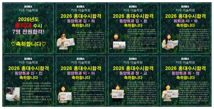 <2026학년도 홍대 수시 1차합격생 7명 전원합격! > 2027 홍대 수시를 준비하는 입시생 이라면! 작품분석과 드로잉표현수업은 3월부터 시작해야 합니다. 홍대 면접은 작품을 설명하는 시험이 아닙니다. 작품을 바라보는 ‘개인의 시각과 관점’을 묻는 시험입니다. 그 관점은 단기간에 만들어지지 않습니다. 작품을 반복해서 보고, 자신의 언어로 정리하고, 질문을 통해 사고를 확장하는 시간이 필요합니다. 키마 홍대 대비 수업 구성 - 키마 자체제작 전문 교제로 수업 - 작품을 읽는 구조 훈련 - 조형 요소와 관점을 연결하는 분석 수업 - 개인 관점을 명확히 드러내는 표현 훈련 - 관점을 시각적으로 완성하는 드로잉 심화 수업 말로만 정....... <img src="https://blogthumb.pstatic.net/MjAyNjAzMDNfMzYg/MDAxNzcyNTI5NDY5MDEw.HkoU-S56FBGqh-PBXS0qVBNLjCA1gPc6f0e4C9a3CKYg.dNqNAQNk-D2YhfCIryaBFFuPaMzvHlxp8Cr41GcgE_sg.JPEG/%C5%B0%B8%B6_%C8%AB%B4%EB%BC%F6%BD%C3_%C7%D5%B0%DD.jpg?type=s3" />