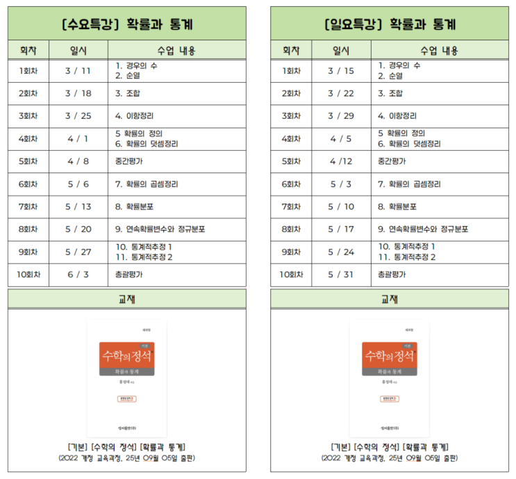 고등학교 진학 전, 가장 전략적으로 준비해야 할 수학 과목~!! 확률과 통계 많은 학생들이 단순 계산으로 접근했다가 고등 내신과 수능, 가장 중요한 순간에 큰 코 다치는 과목입니다. 파인만 영재고센터에선 [확률과통계 10회 완성 커리큘럼]을 오픈합니다. 주1회, 기본정석으로 확률과통계 개념 공부를 진행합니다. 개념의 본질을 꿰뚫는 깊이 있는 수업을 경험해 보세요~!! 왜 '기본정석'인가? 수학의 바이블이라 불리는 기본정석으로 개념을 가장 정교하게 설명하고 이해시킵니다. 실전에서 변형될 수 있는 핵심 문제들을 완벽히 분석하겠습니다. 우리 학생들의 바쁜 스케쥴을 고려하여 주1회 집중 수업으로 구성 -수요일 or 일요....... <img src="https://blogthumb.pstatic.net/MjAyNjAzMDNfNCAg/MDAxNzcyNTM4NjEyNDM1.3WfPyM8ynBL7_PgE_MBFO4ojyw1NamwVZMY2tIyajj0g.Gu8PCPAPYt-mJdUEEpLYVl-vTSmZy19IsYv1bntmOYEg.PNG/image.png?type=s3" />
